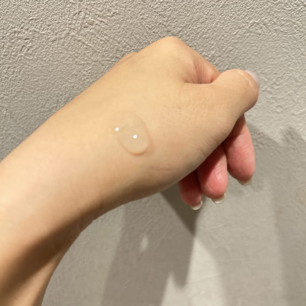 水分量の多い見た目ですが、揮発性が高い感じでもなく、ジェルとクリームの間といったところ。香りはなく、香料が苦手な人でも大丈夫そうです。正直、肌に馴染む感じはつるっとしたテクスチャーが邪魔している印象もあります。でも夏のこの時期にはベタつかない、それでいて保湿されるのも良いところ。