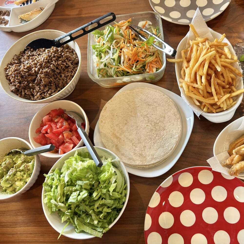 お肉は市販のシーズニング(オールドエルパソ一択!)、あとは野菜を刻むだけ。テーブルも華やかになるのでお友達呼んでのホームパーティーにぴったりです。トルティーヤは最近はソフトばかり。子ども達もこのトルティーヤが好きで、これだけをパンかのように食べていました。笑