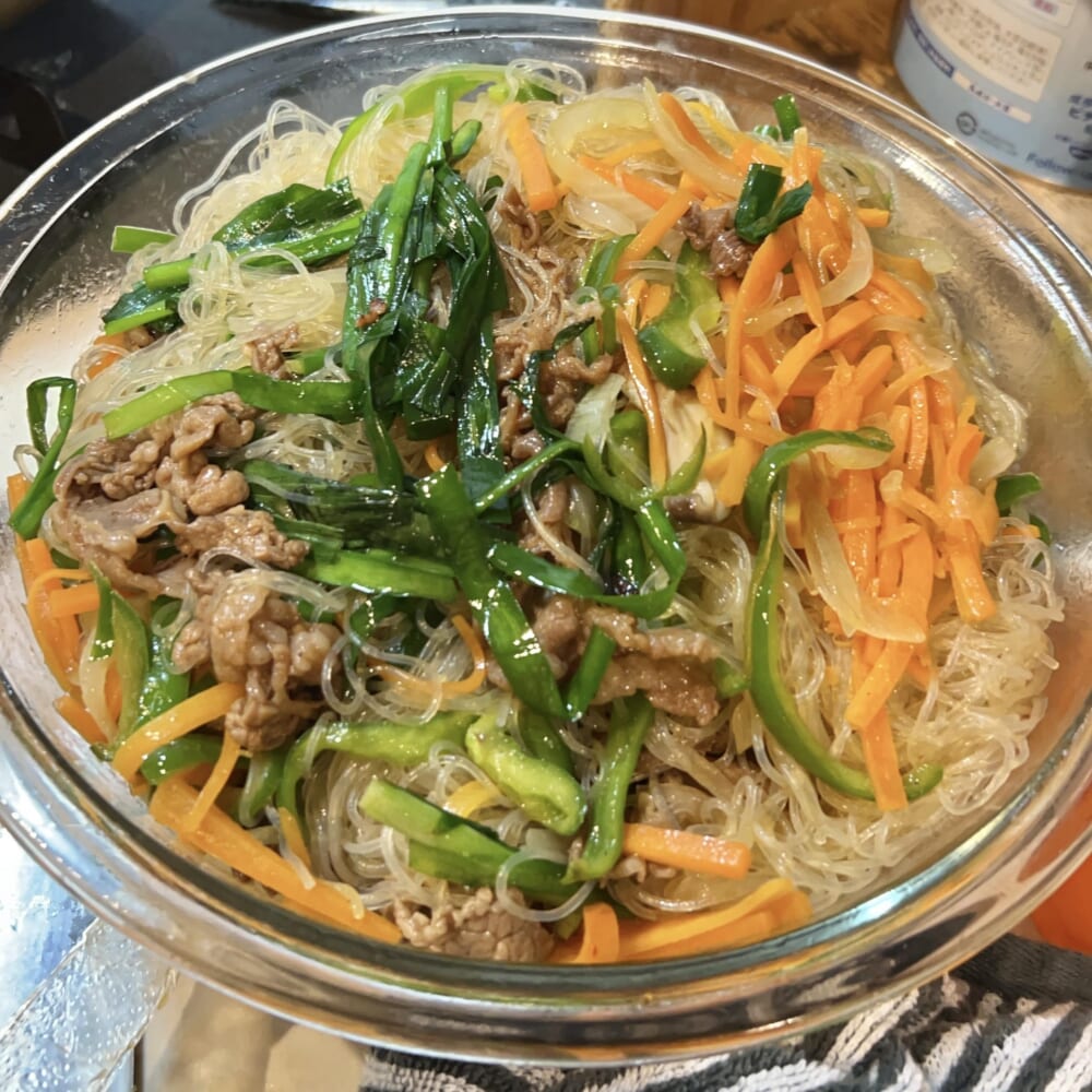 野菜はそれぞれ具材は千切りにして、あとはごま油と少しの塩で炒める。牛肉も細切りや食べやすい大きさに切って、焼き肉のたれで炒める。春雨は軽く戻して、醤油・お砂糖・水で(これも面倒だったら焼き肉のたれ・水)水分がなくなるまで炒める。出来上がった順にどんどんボウルに入れて、全体を混ぜて、最後にごま油を回し入れて馴染むようにからませたら完成。私はビニール手袋で、現地オモニのように混ぜてます。