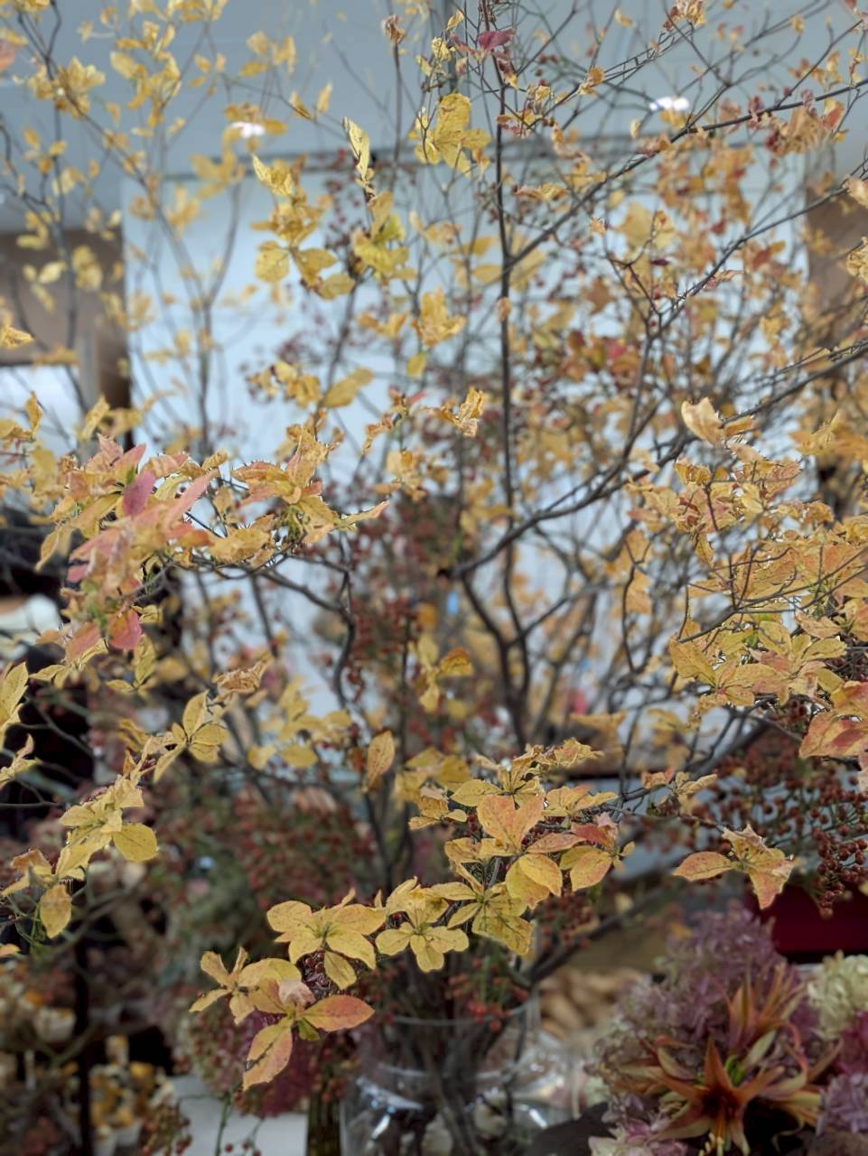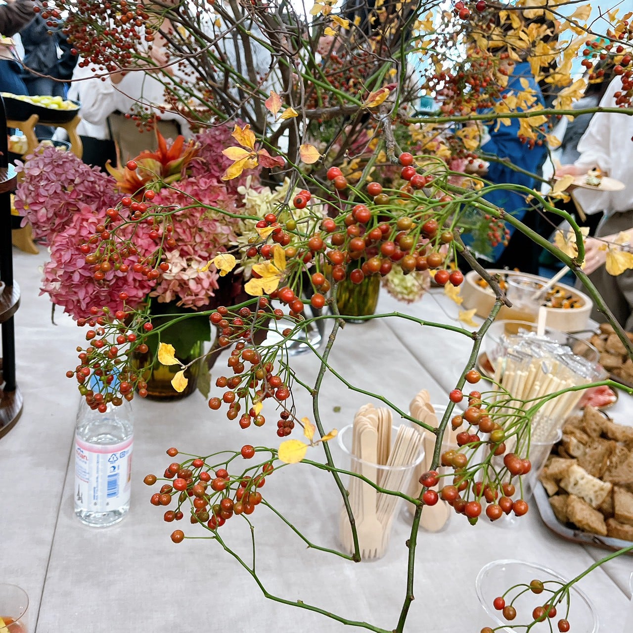 会場の真ん中を彩る、メインテーブルの枝ものは、紅葉した「ドウダンツツジ」と「のばらの実」とのこと。