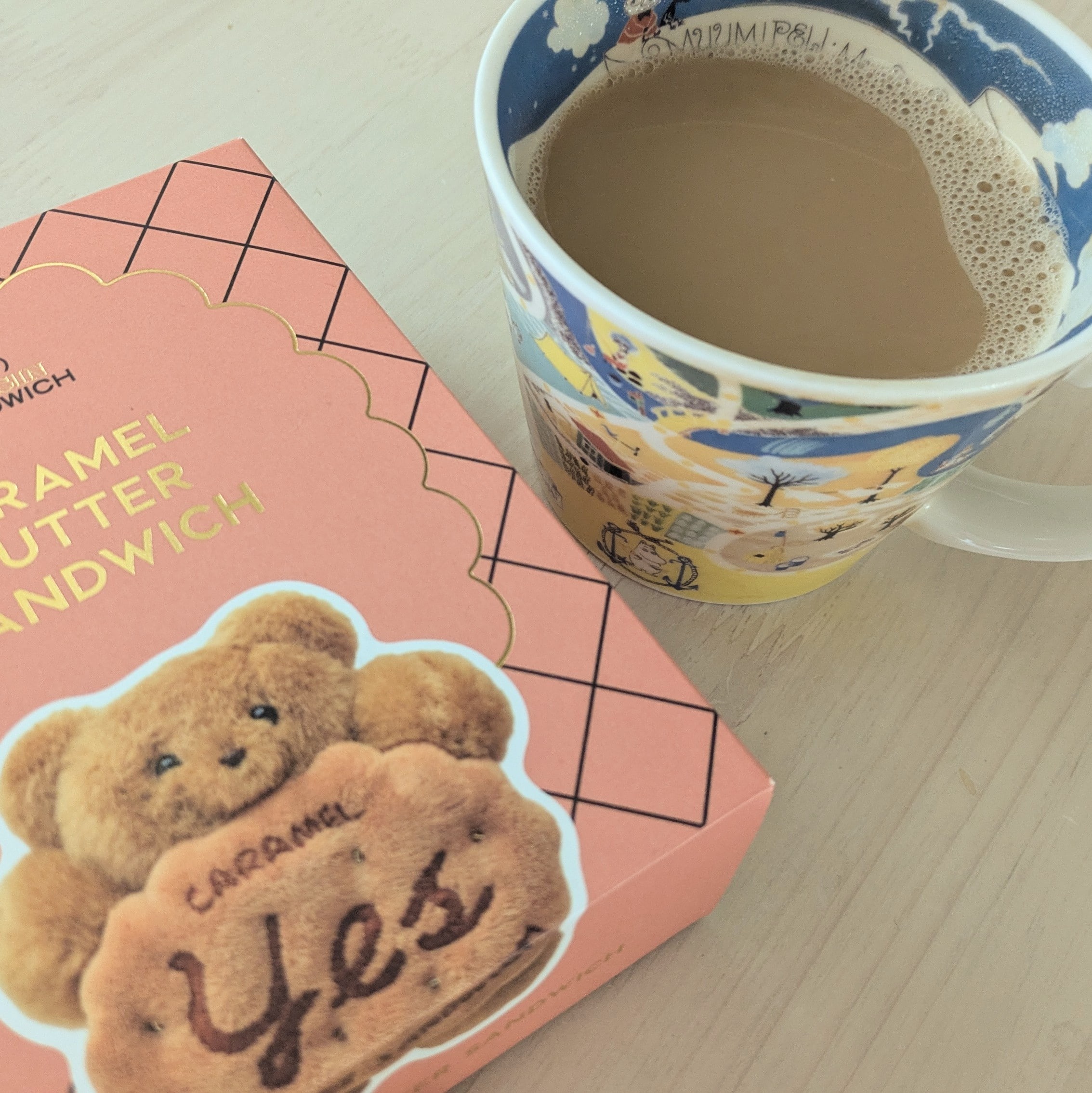 この日は、お気に入りのムーミンのマグカップに入れて、 お土産に買った「CARAMEL BUTTER SANDWICH」と一緒におやつタイムを楽しみました。