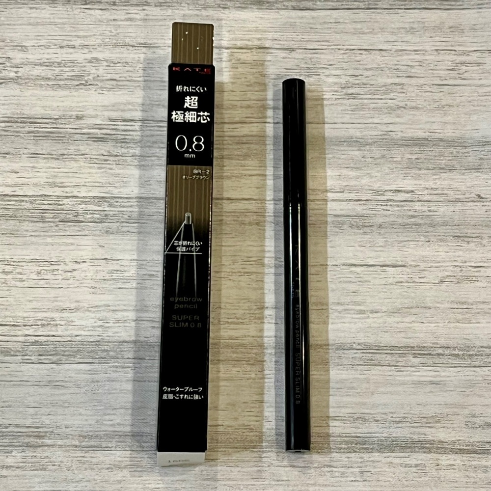 これまでに何本もリピしているセザンヌの極細芯のアイブロウペンシルも使い終わったのでドラッグストアに行ったところ、さらに細い0.8mm芯のKATEのアイブロウペンシルを発見!