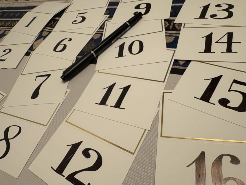 番号の書いた席札を会が始まる前にテーブルにセッティングして、あみだくじで当たった番号の席に座ってもらい、席札の番号の裏面に名前を書いてもらうようにしました。