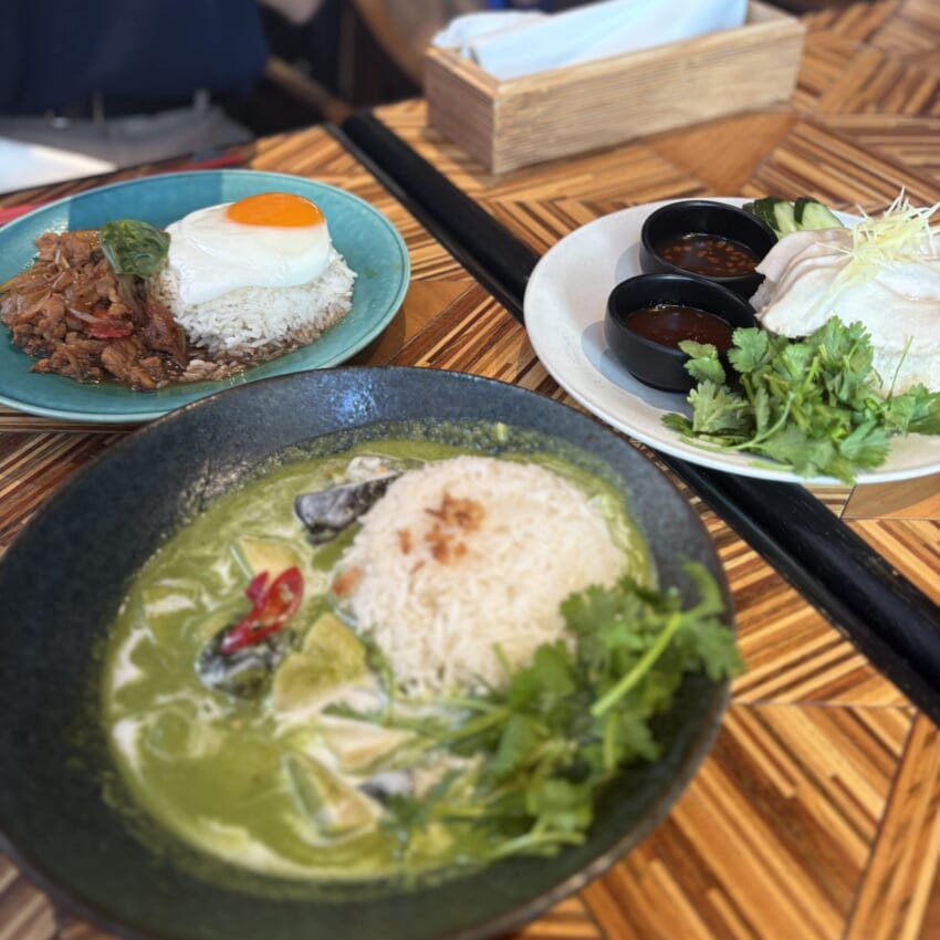 ゆかりんごちゃんはカオマンガイ、さきちゃんはガパオ、私はグリーンカレーと