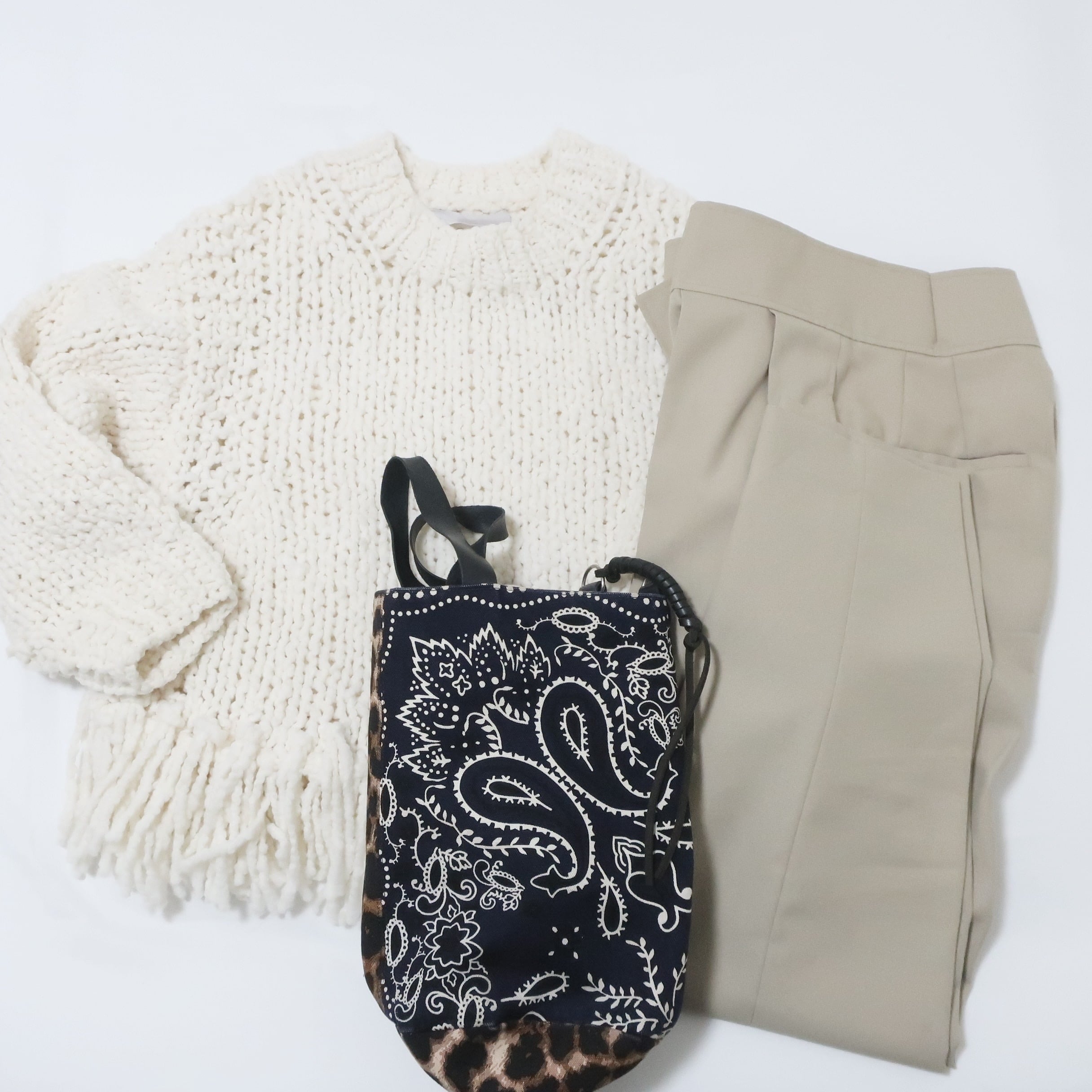 合わせたボトムは、1er arrondissement のタックテーパードパンツ(明るいベージュ)。プリント柄が華やかなバッグは愛用しているマニプリのもの。