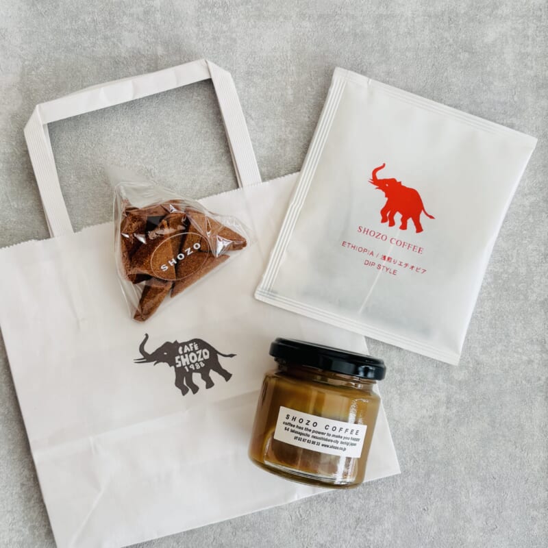 マドレーヌなどの焼菓子はあまり日持ちがしないため、ディップコーヒー、コーヒージャム、ココナッツマカロンの詰め合わせを。