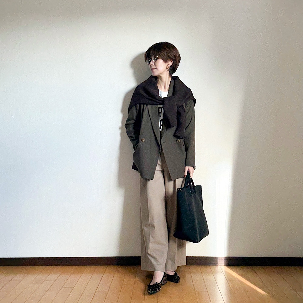 ジャケットの上に肩掛けして、こなれ感の演出を。同色系でまとめることで、さりげないポイントになるかなと。オフィスコーデとしてもいけちゃう!?
