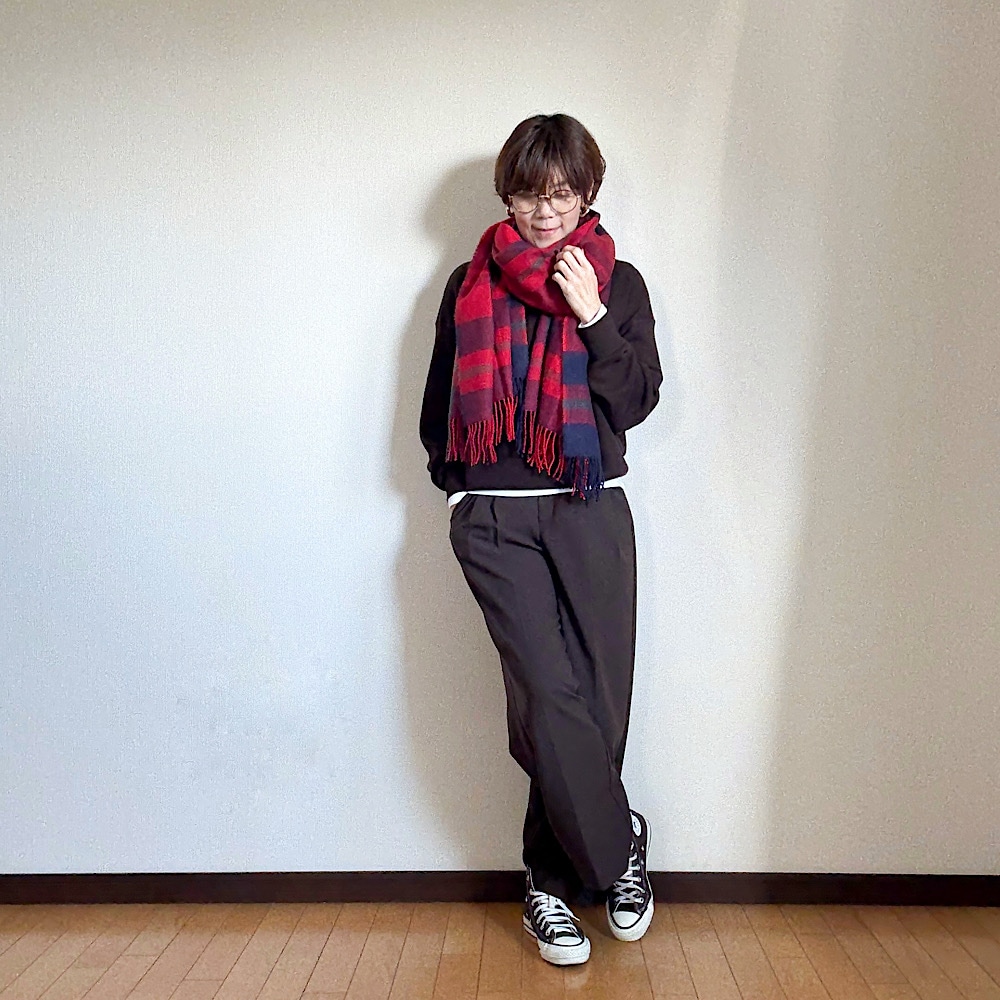 ブラウンのワントーンで揃えたコーデに赤のストールで地味にならないアクセントを。あれこれコーデを考えるのが面倒~ってときのお助けコーデ。