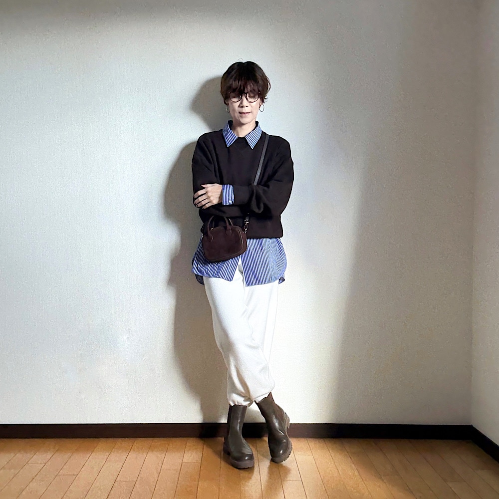 セーターの丈をあえて短丈にし、レイヤード感を強調。ボトムスはニットジョガーパンツ×ブーツでカジュアルダウンさせてみました。