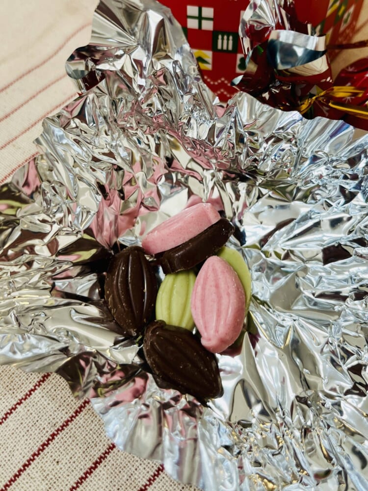 クリスマスらしい色合いとペリカンのパッケージが可愛いこちらのお菓子は「カカオパーニュ」と名付けられたカラフルなチョコレートです!