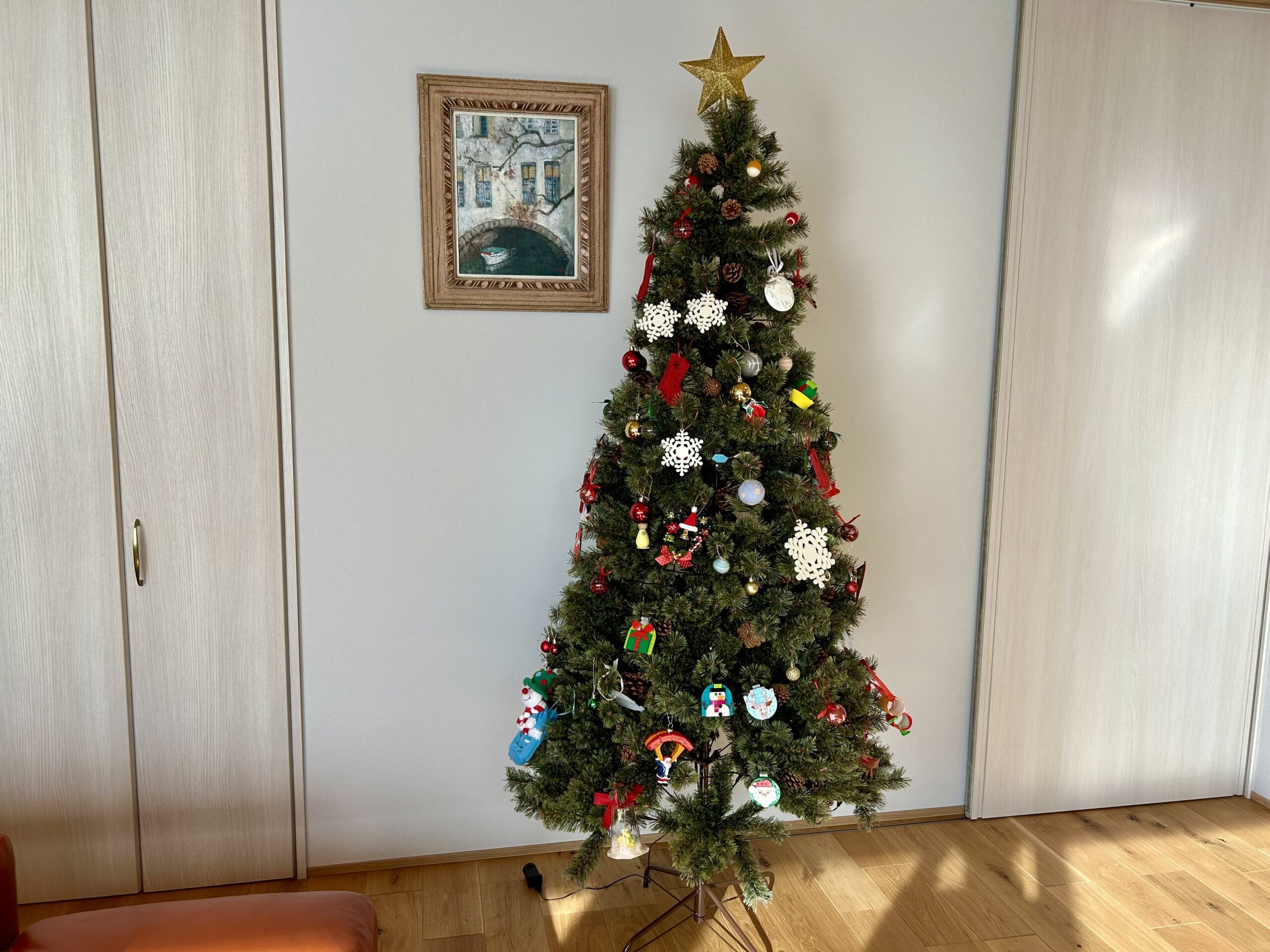 マンションから今の戸建てに引っ越してきて、今年が4回目のクリスマスです。クリスマスツリーは、今の家に引っ越したタイミングで大きめのものに買い替えました。オーナメントはそれまでのツリーに飾っていたものや、私の両親がプレゼントしてくれたもの、お出かけ先でのお土産、息子が保育園・幼稚園時代に工作で作ったものなどなど・・・統一感がなくておしゃれとはかけ離れていますが、ひとつひとつに思い出があり、私は気に入っています。