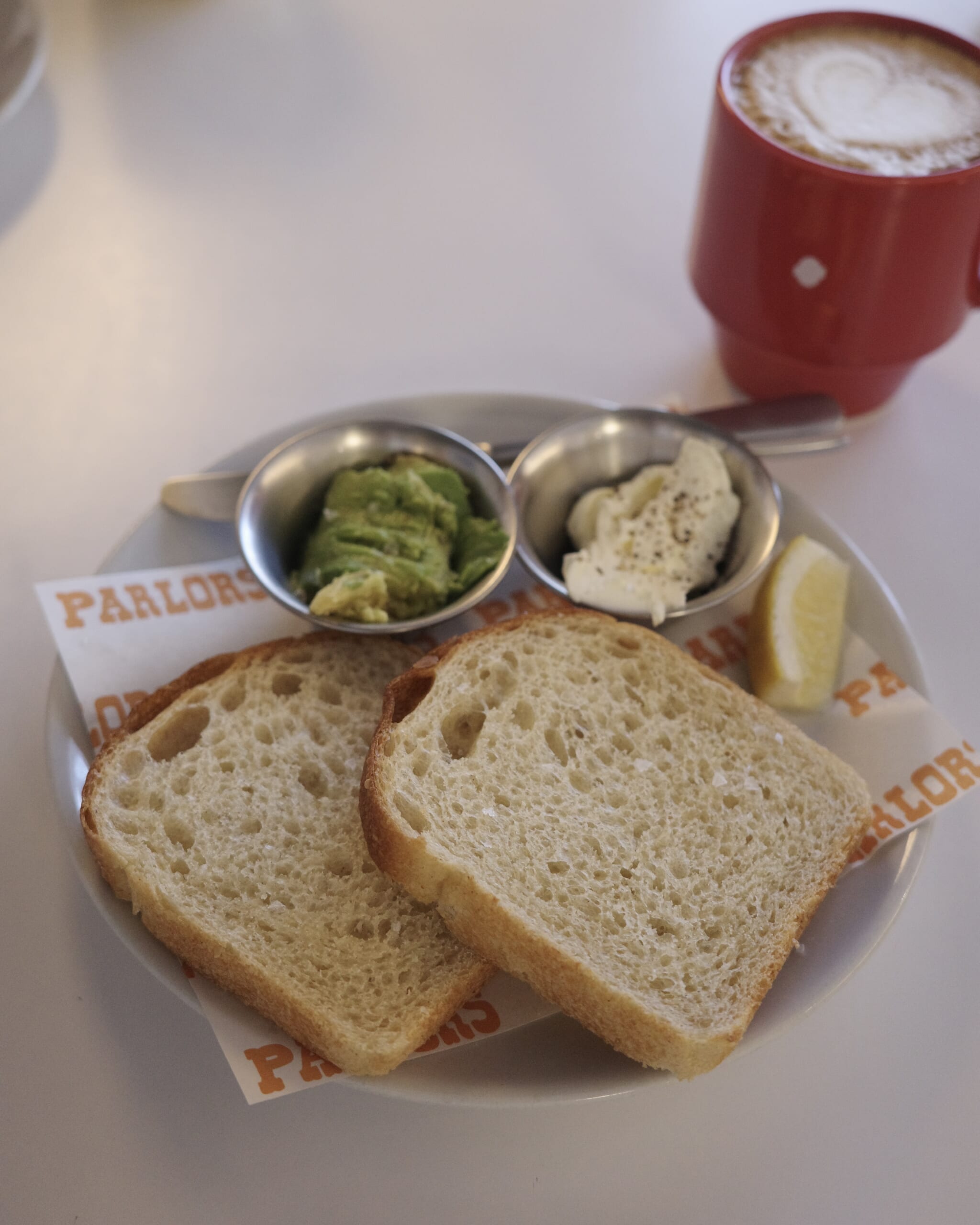 たっぷりお粉がまぶされたドーナッツにそそのかされながらアボカドトーストをいただきました。ふわふわのラテも美味しかった〜♡