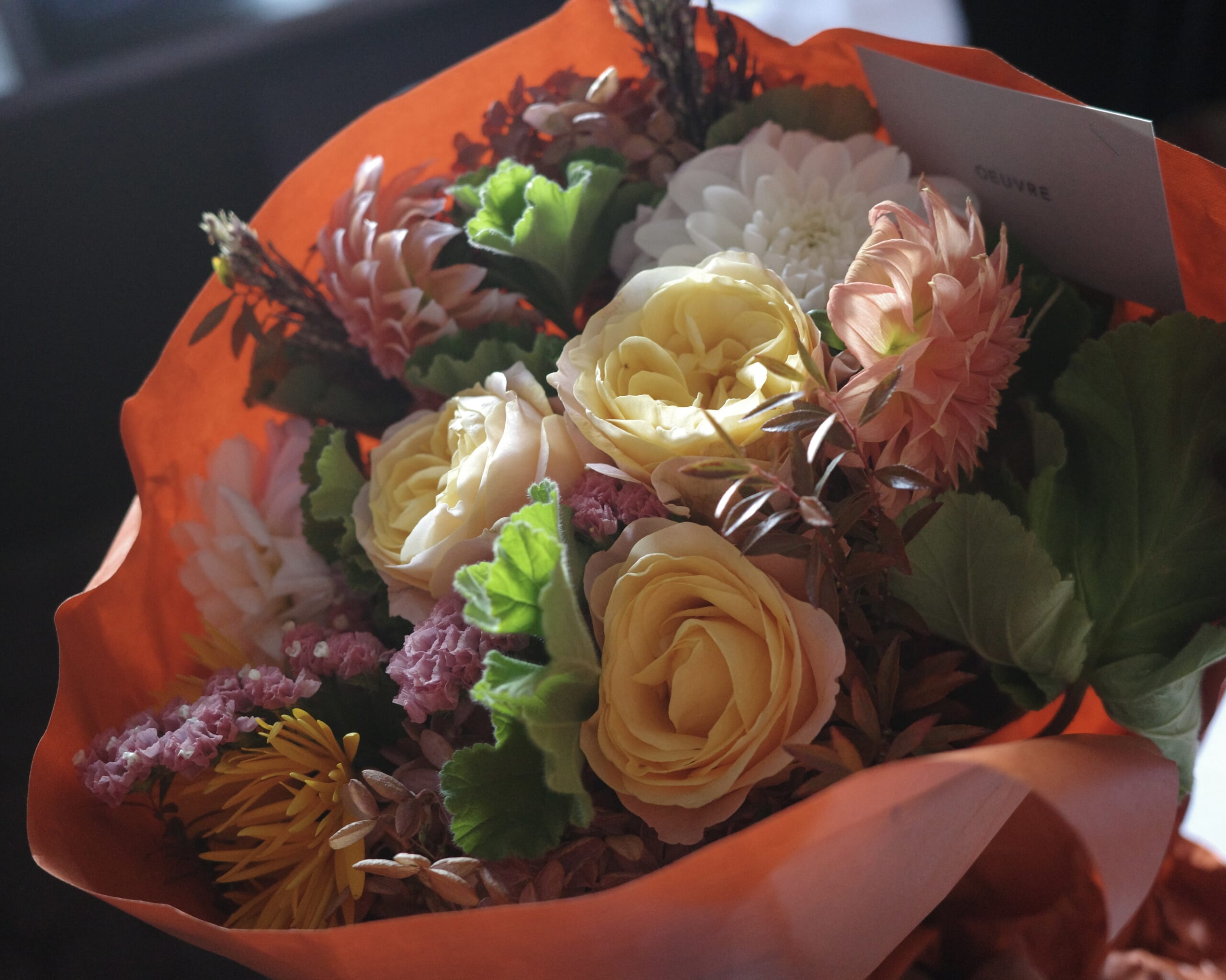 喜多編集長からじきじきにいただいた、ウヴルさんのブーケと感謝状💐 ダリアやバラがあふれんばかりに入っていて、想像以上のボリュームと華やかさにうっとり。