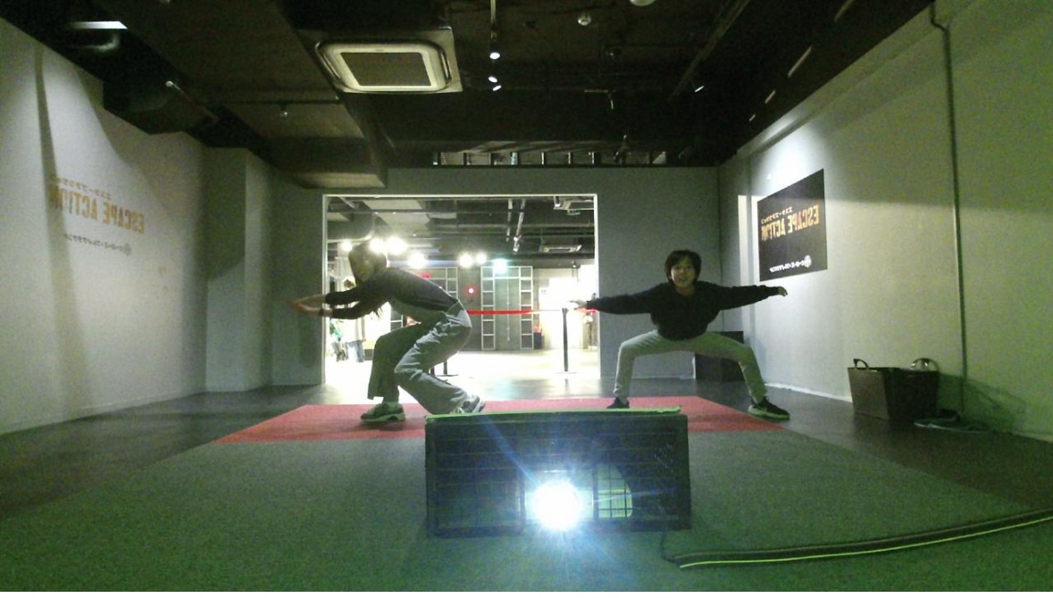 ゲーム体験中の親子。プレイ中の姿を写真に収めてくれて、QR読み取りで写真もゲットできます。結構体を動かすアトラクションが多いのでスニーカーや動きやすい服装がおすすめ。