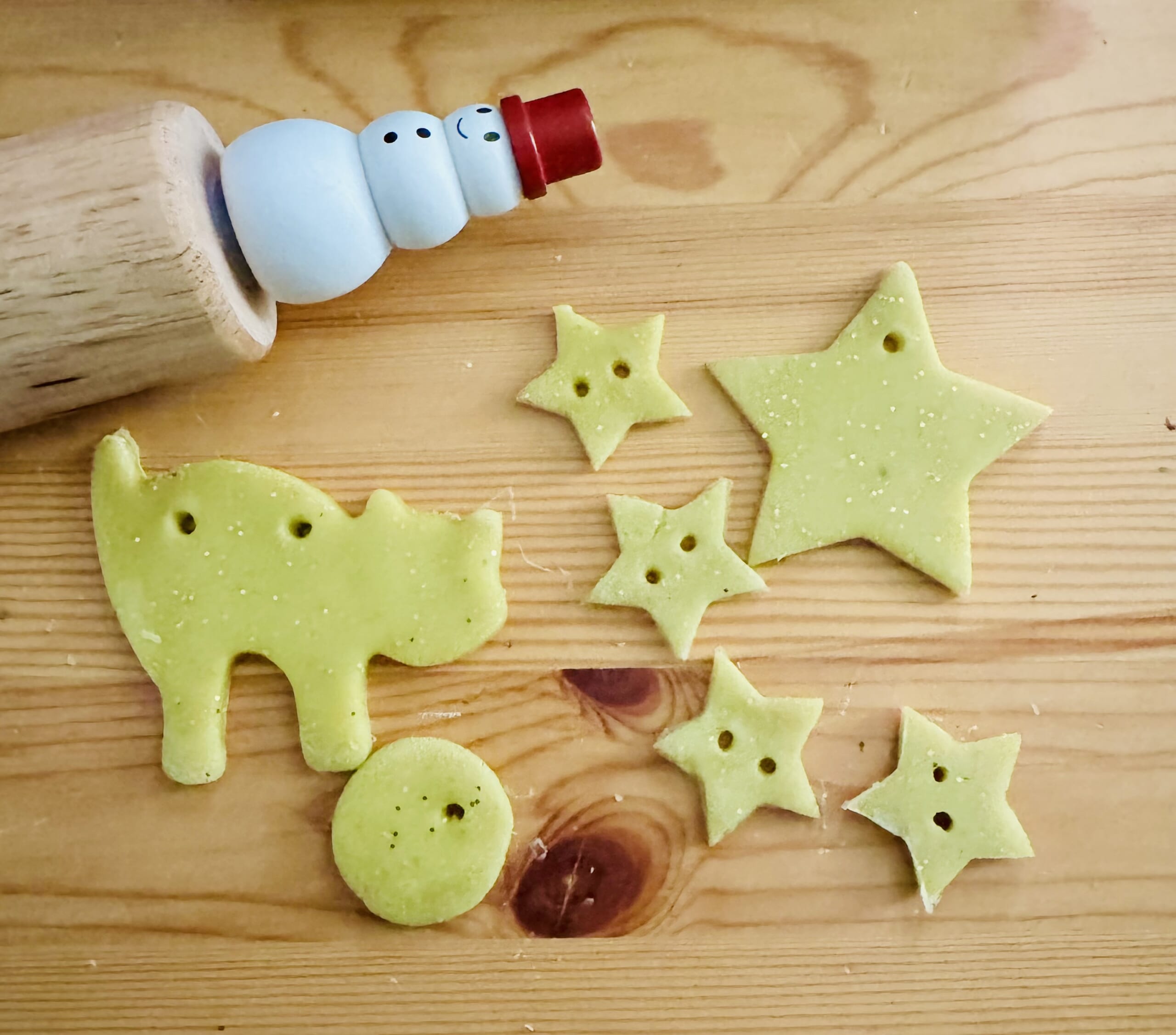チルドレンミュージアムのワークショップで作った小麦粉粘土。冷蔵庫に保管されたまま遊んでないので、満を持してクリスマスの飾りにしちゃいます。