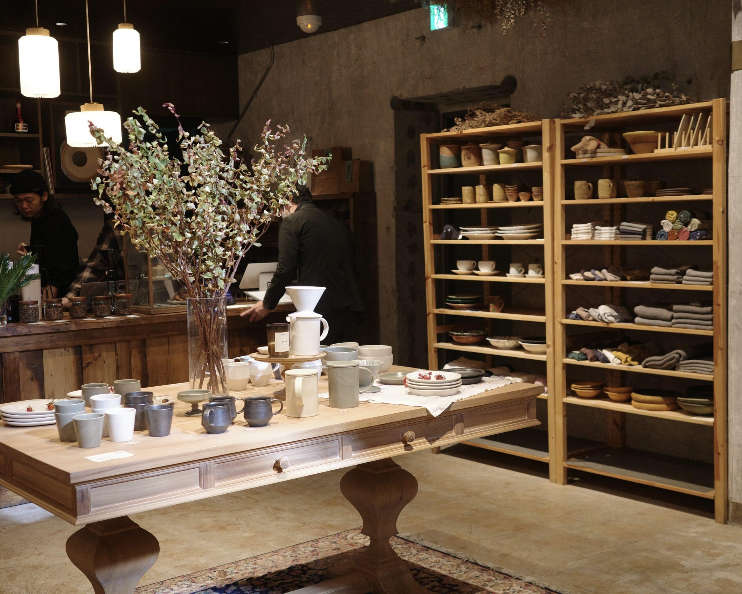 まずは地下フロアから。コーヒーバーに雑貨屋さんがくっついたような「coin」。食器やフレグランス、ファブリックなど、小さなスペースにぎゅっと物が集まっていて楽しい〜。