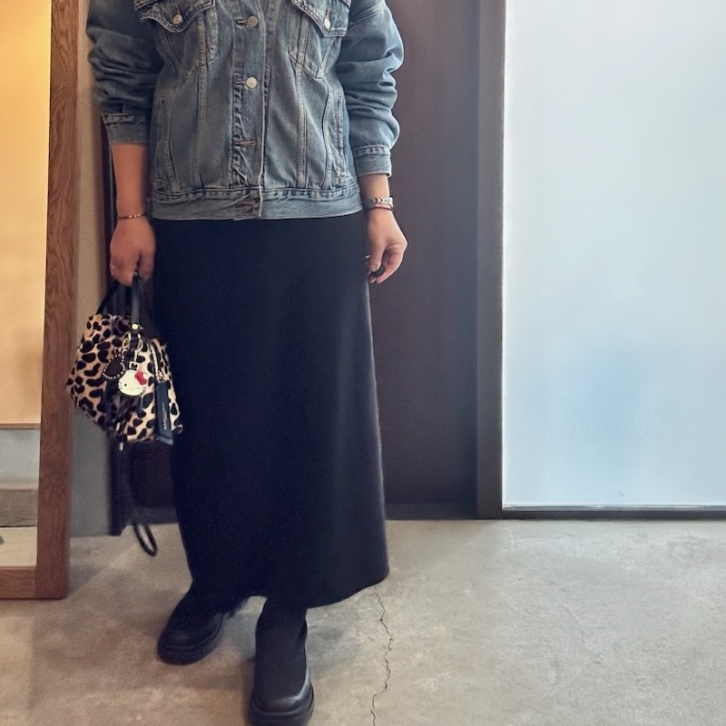 Gジャン/Levis 、 knit/UNIQLO、 skirt/UNIQLO、 boots/石岡真美×Dhyana.、