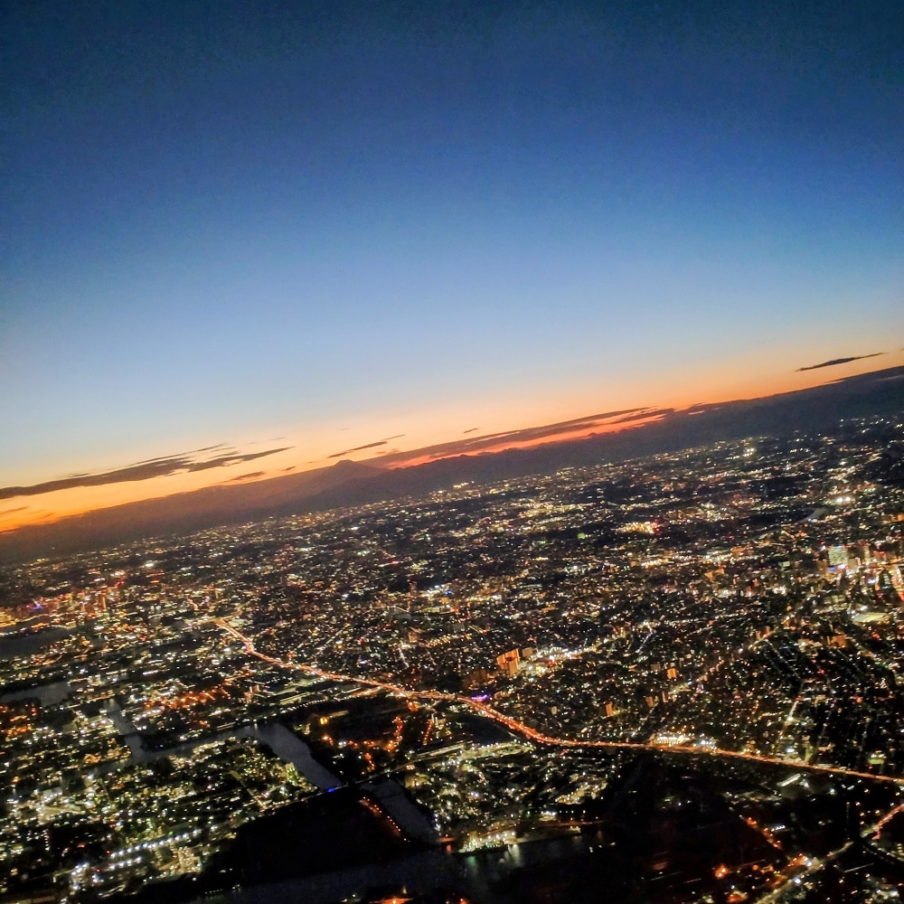 最後は東京上空から。夕方と夜の境目を飛ぶ飛行機。無事に元気で大阪へ帰ります。