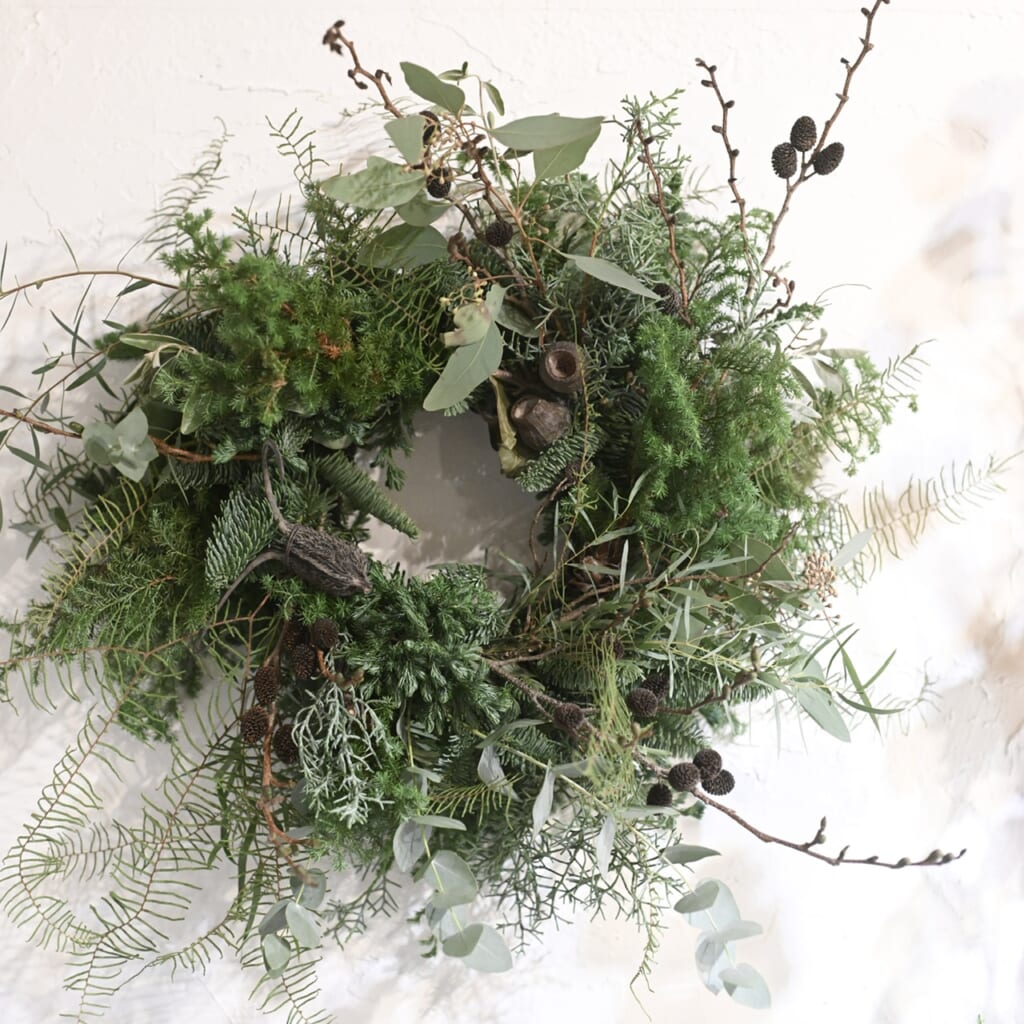 ベースのボリュームや、実ものやグリーンを調整し、自分が家に飾りたいリースをイメージ。