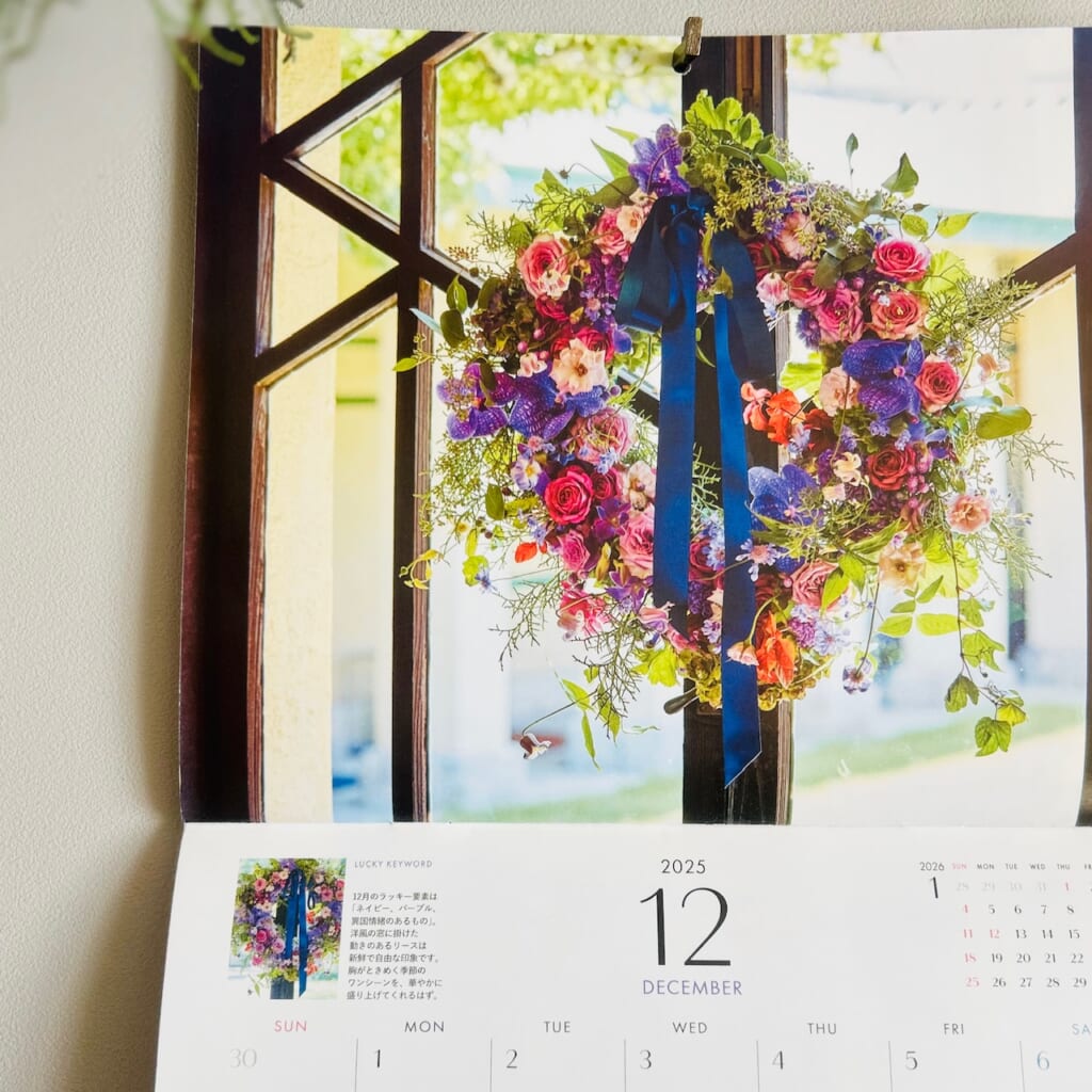 カレンダーのリースでは、紫のアスターやバラに、シルバー系のグリーンが重なり、目を惹く美しさ。