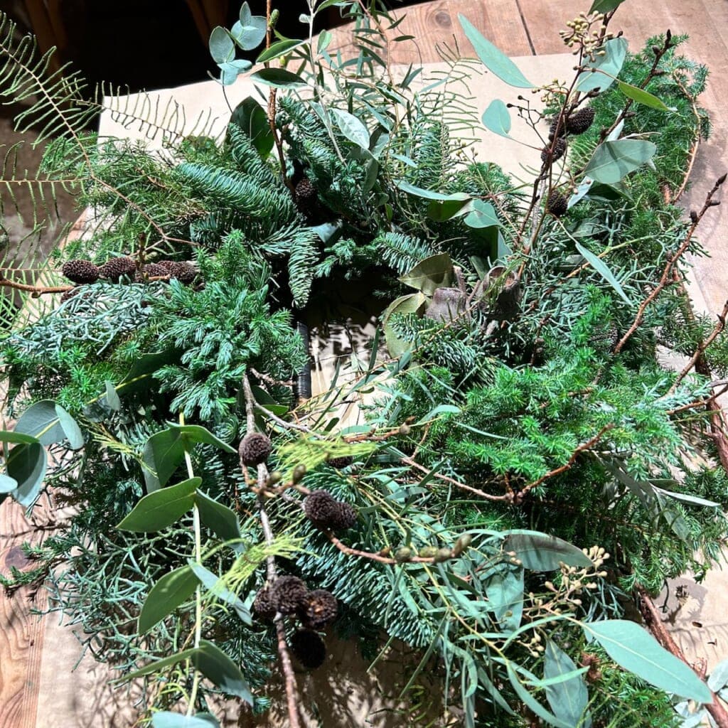 長短のリズムをつけて、フラットではなく動きのある形にすると、ウヴルさんのようなリースになるようです。