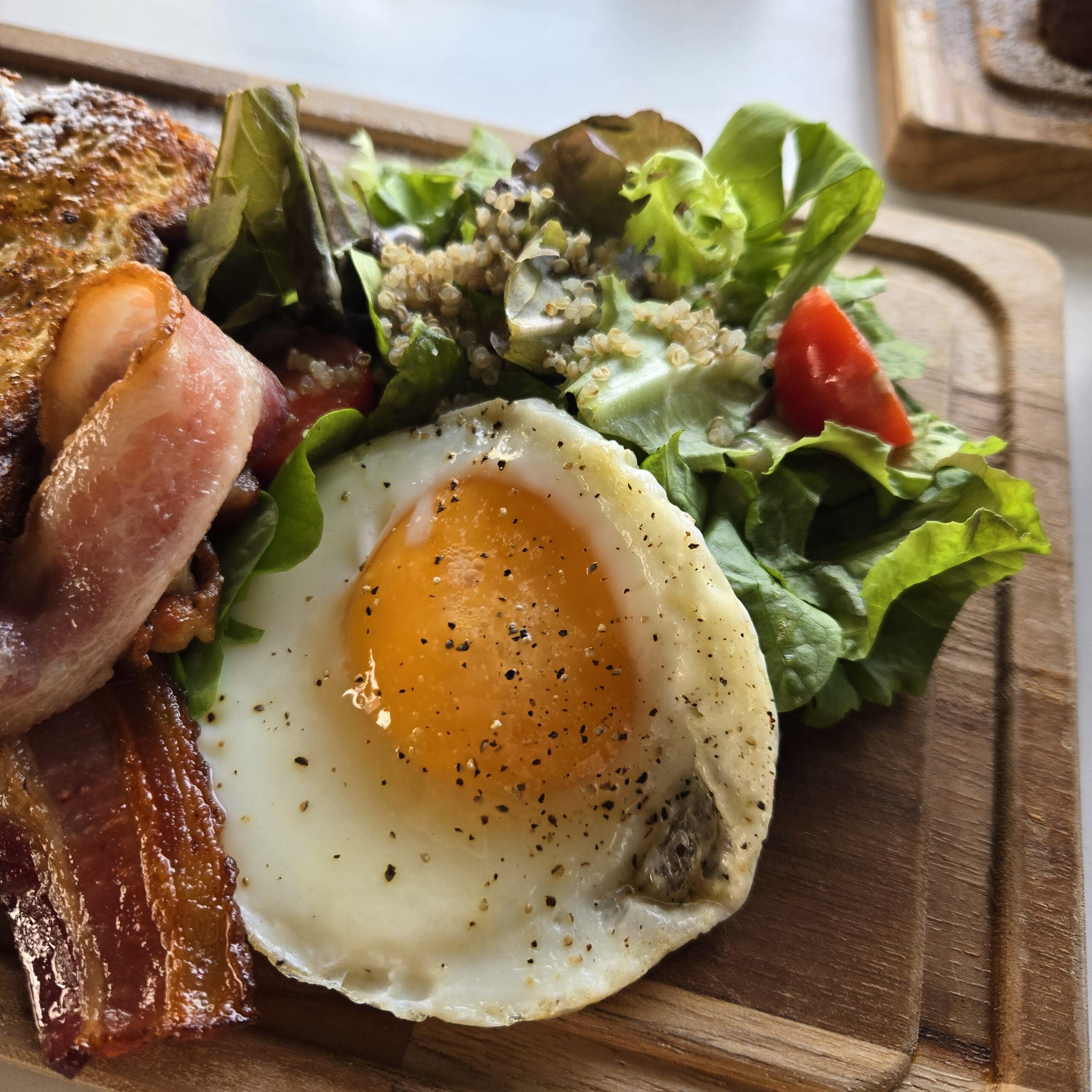 さて!お目当てのフレンチトーストコンボ!DXというスープ付きもありますが、普通の方を。フレンチトーストに、ミニサラダ、ベーコン、目玉焼きが付いてきます♪