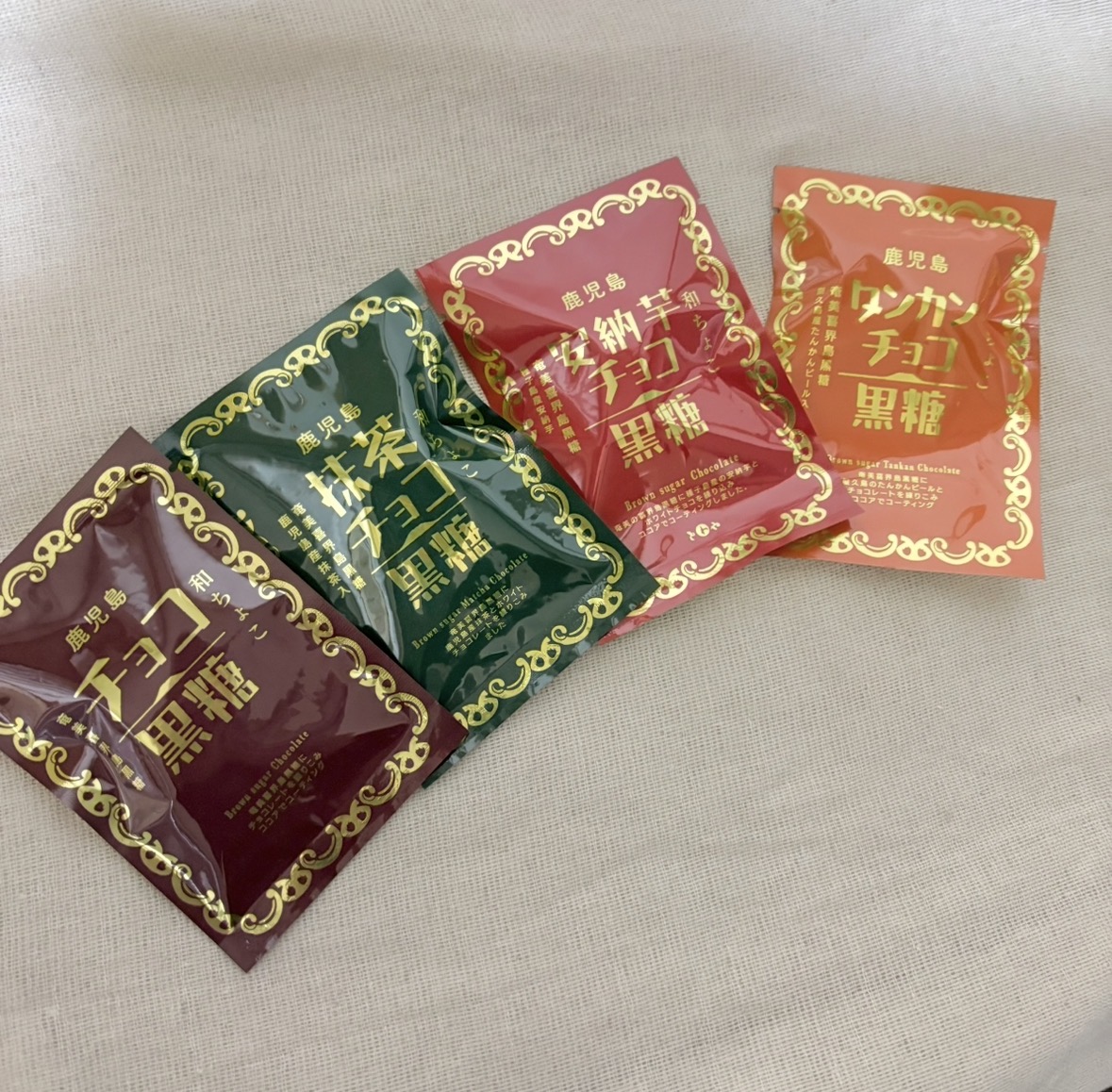 プレーン、たんかん、安納芋、抹茶の4種類のチョコ黒糖の詰め合わせ。一袋のサイズがお配り用にちょうどいいなって♪なにより黒糖ってのが鹿児島らしい!