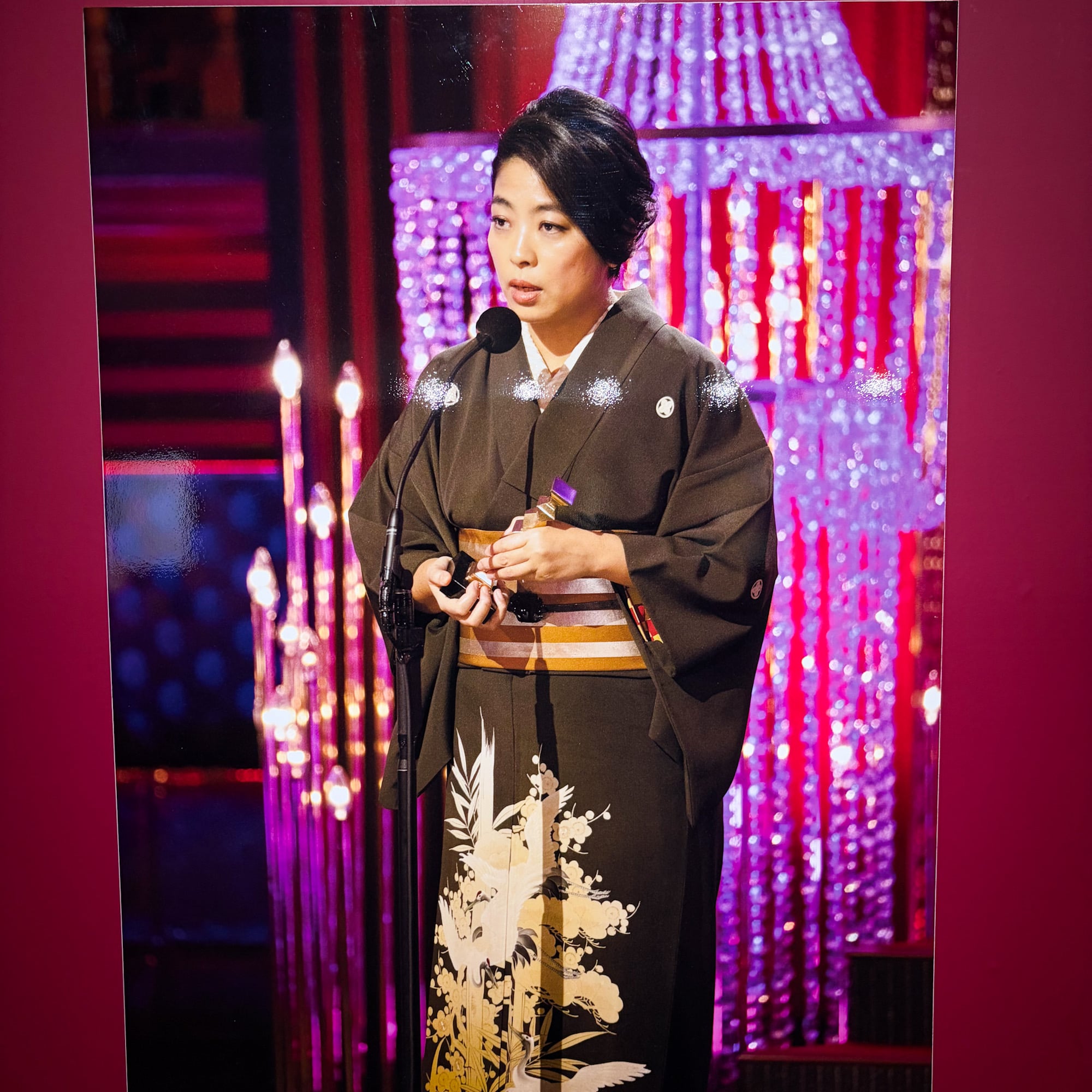 映画「万引き家族」で2019年に最優秀助演女優賞を受賞された希林さんですがその前年に、希林さんは天国へ。代理で也哉子さんが受賞コメントをしている1枚です。それだけでも感慨深く、当時の印象も目に焼き付いています。こちらのお着物は樹木希林さんのお着物でした。
