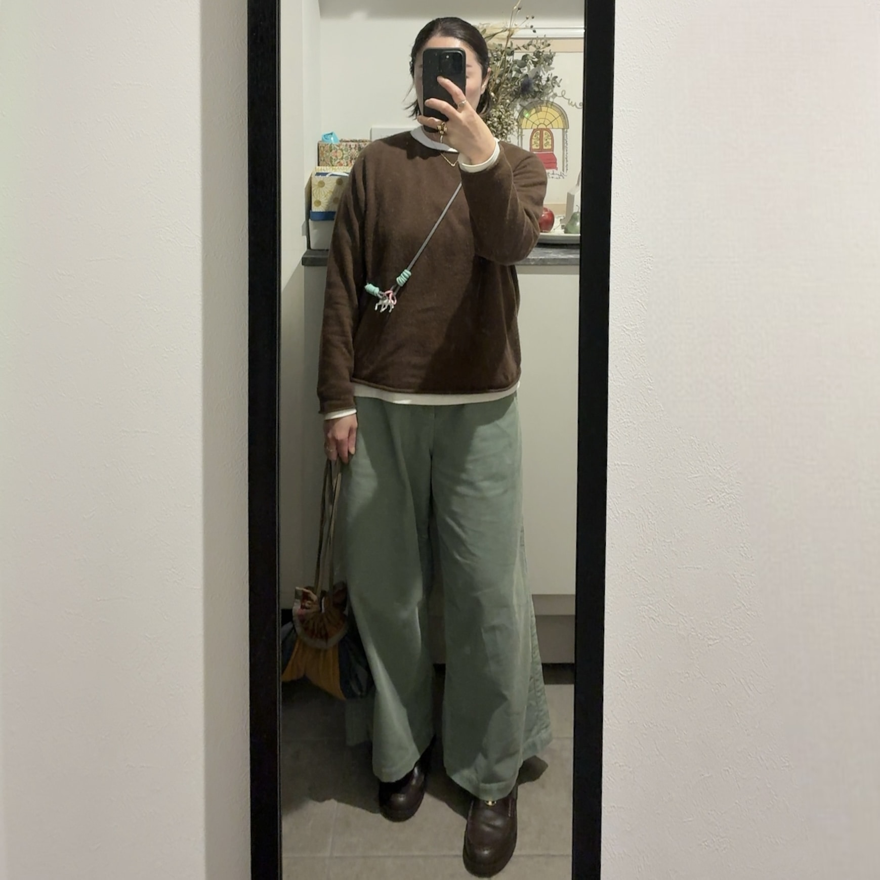 地味色を選びがちなコーデュロイ素材のパンツも今シーズン様々なブランドから綺麗色が多く出ていて、気になっていました。淡めのピンクにも惹かれたのですが、試着してニュアンスのあるグリーンに決定!トレンドのブラウンと合わせれば、即今年らしいスタイリングになります。