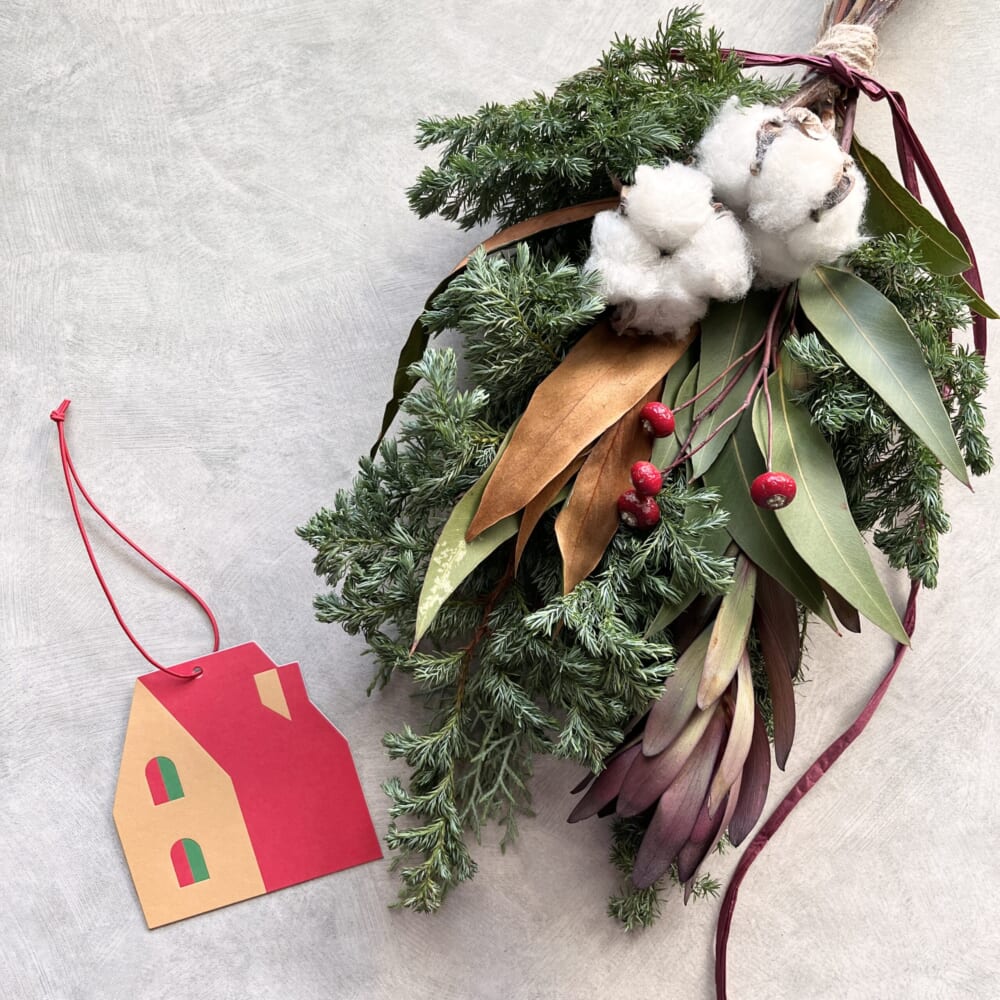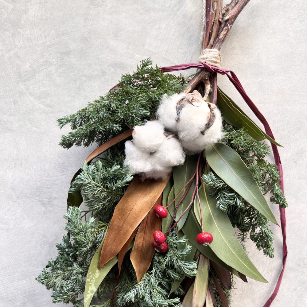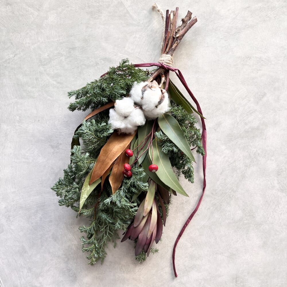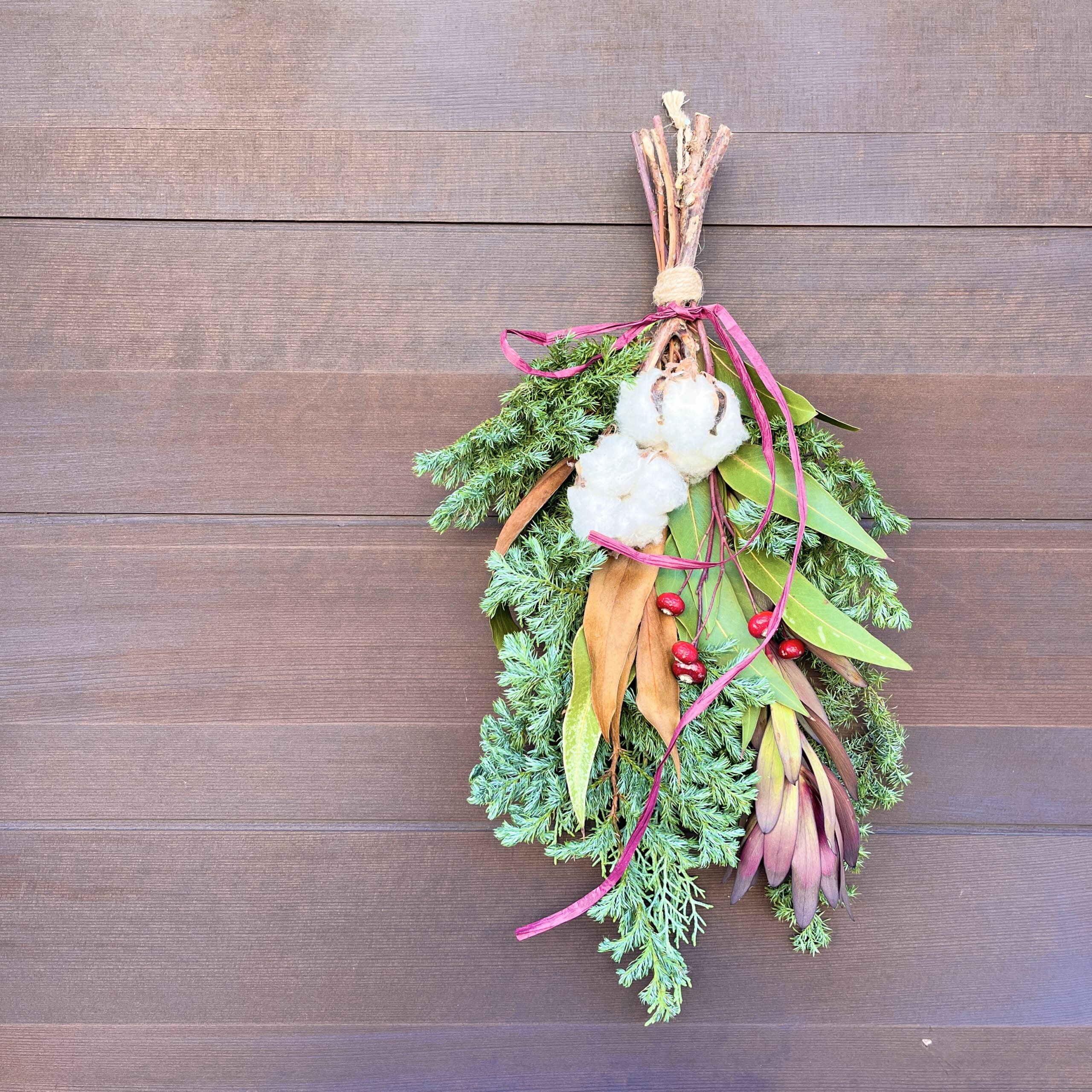 グリーンに赤い実やコットンフラワーが組み合わされています。