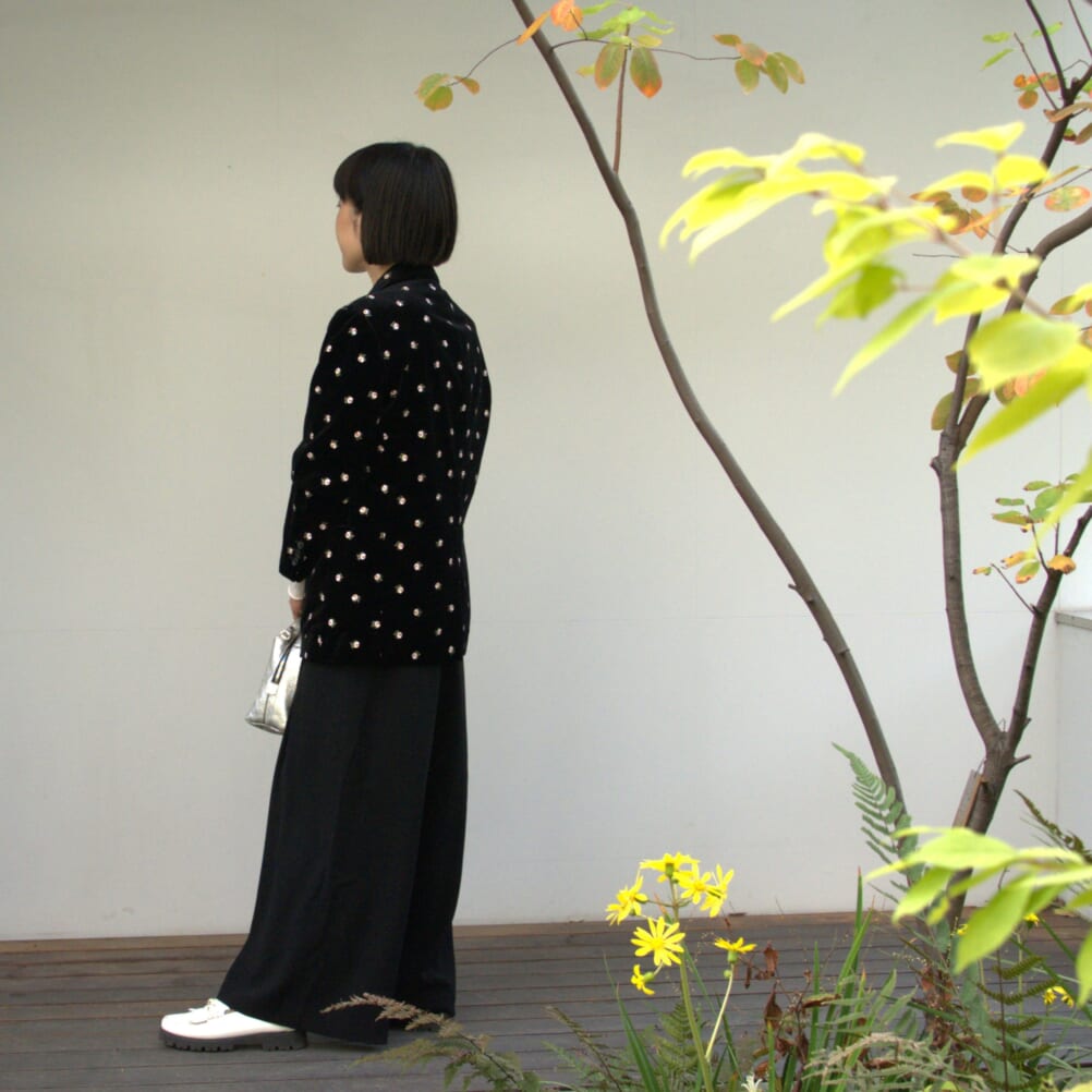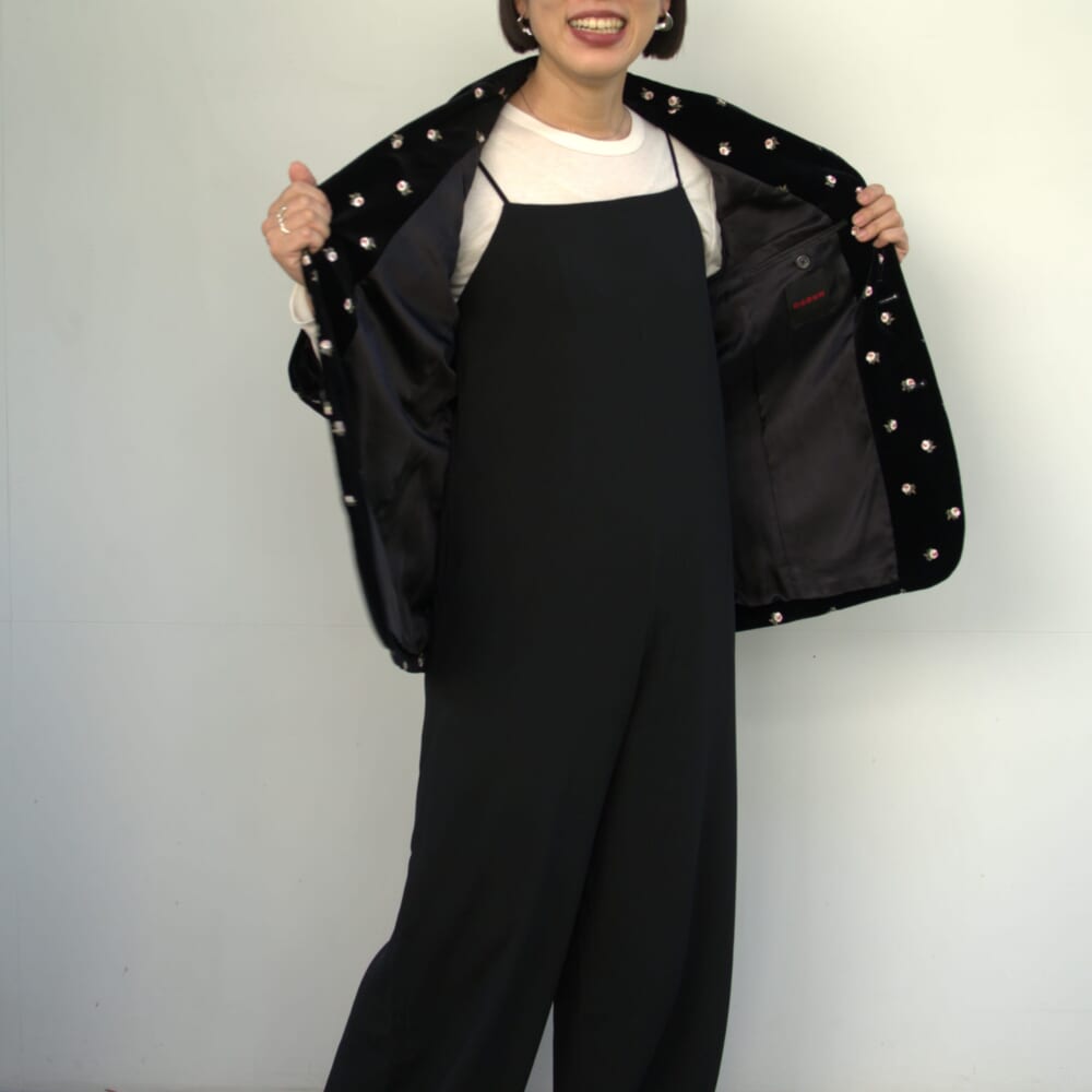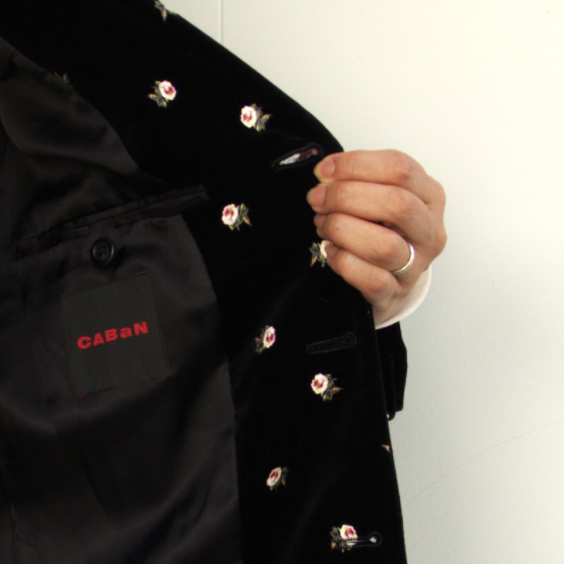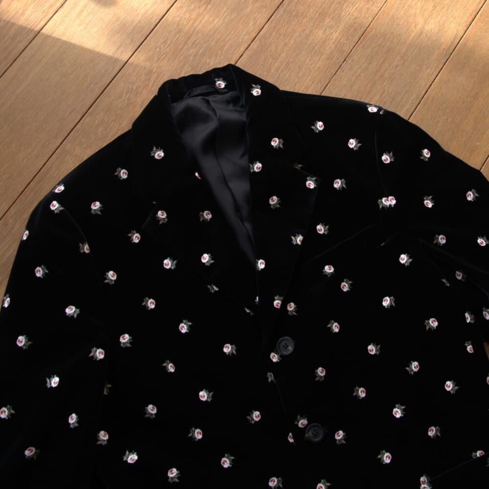 今回のコーデの主役はCABaNのベロアローズプリント テーラードジャケット。