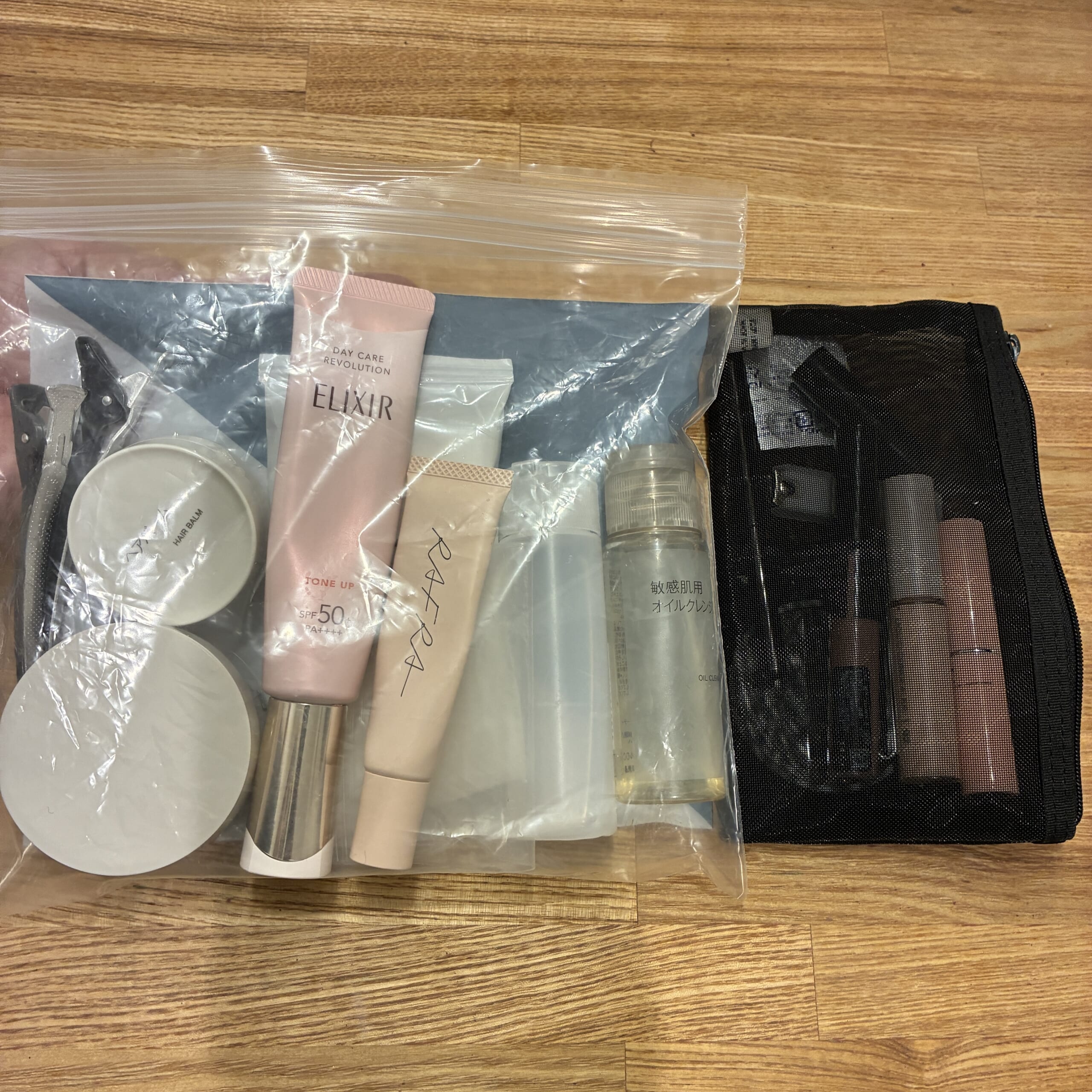 普段と違う場所だからこそいつもの、普段使っている物を使いたいなというのもあって最近はこれを持っていくように。スキンケアやメイクアイテムはこんな風にまとめて持っていきます。