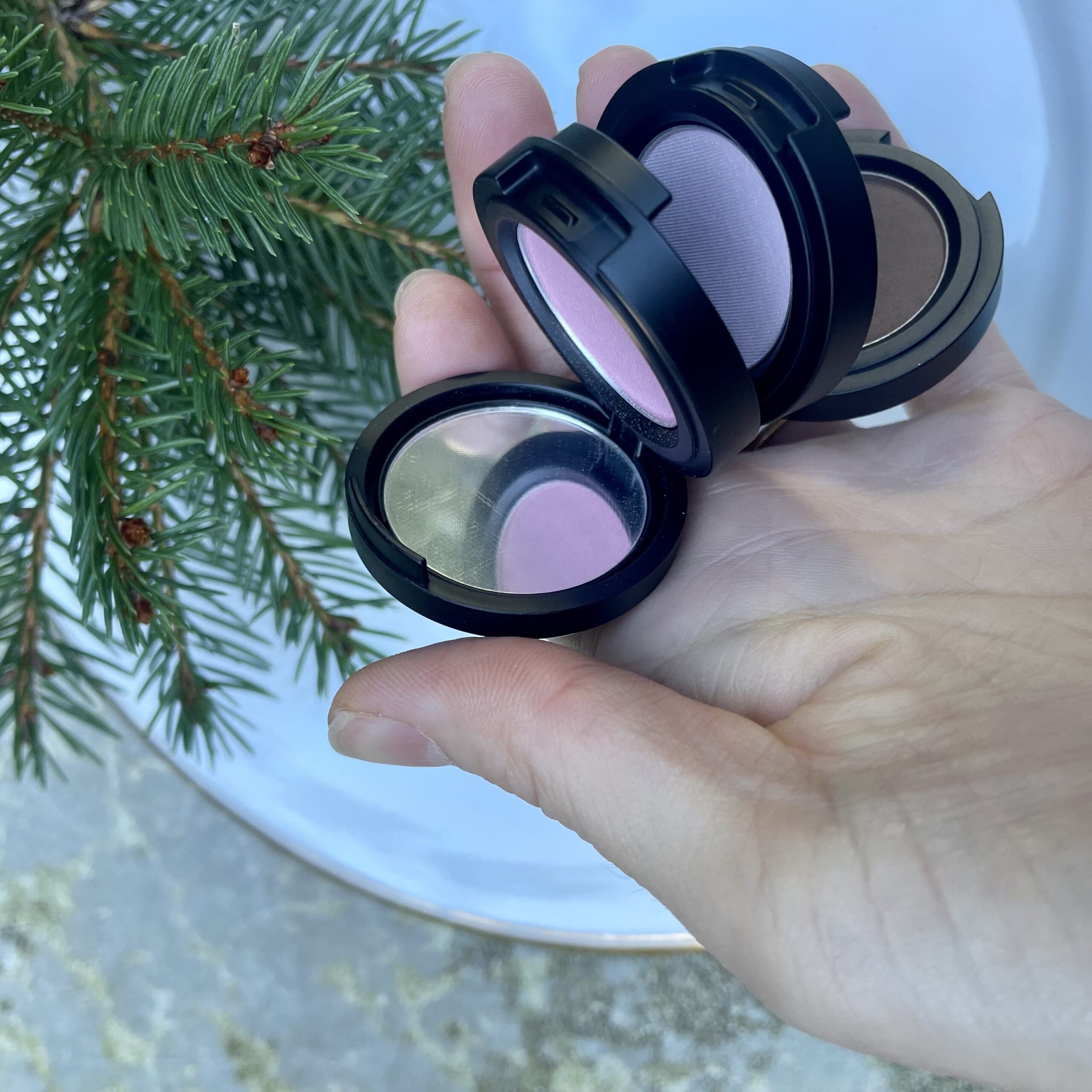 ②淡いパープルのフェイスパウダー→ハイライト、ベースメイクの仕上げのセッティングパウダー、メイク直しに
