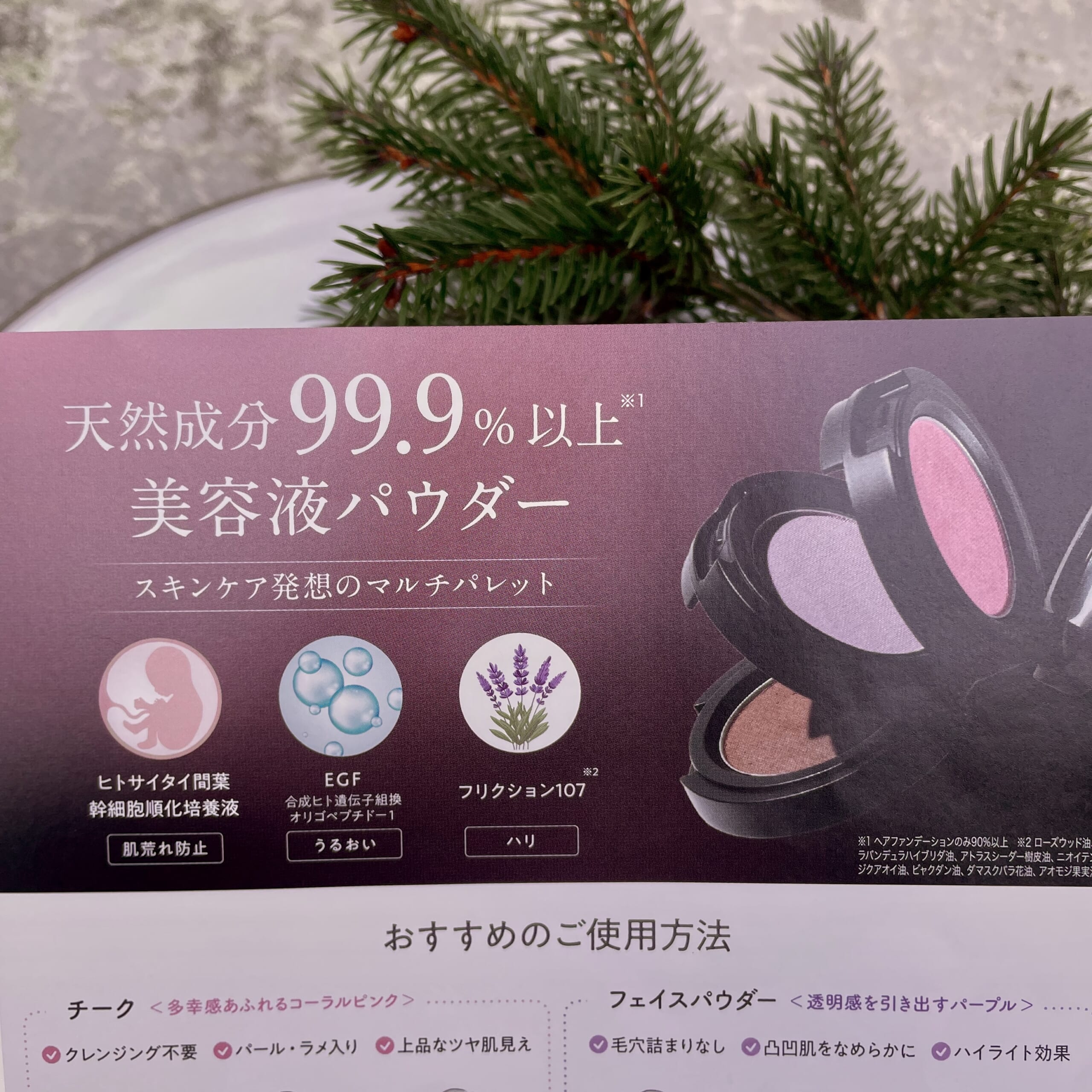 なんとこちら、天然成分99.9%以上(ヘアファンデーションは90%以上)の美容液パウダー。チーク、フェイスパウダー、ヘアファンデーションの3in1がポーチインサイズになっているという優れもの。