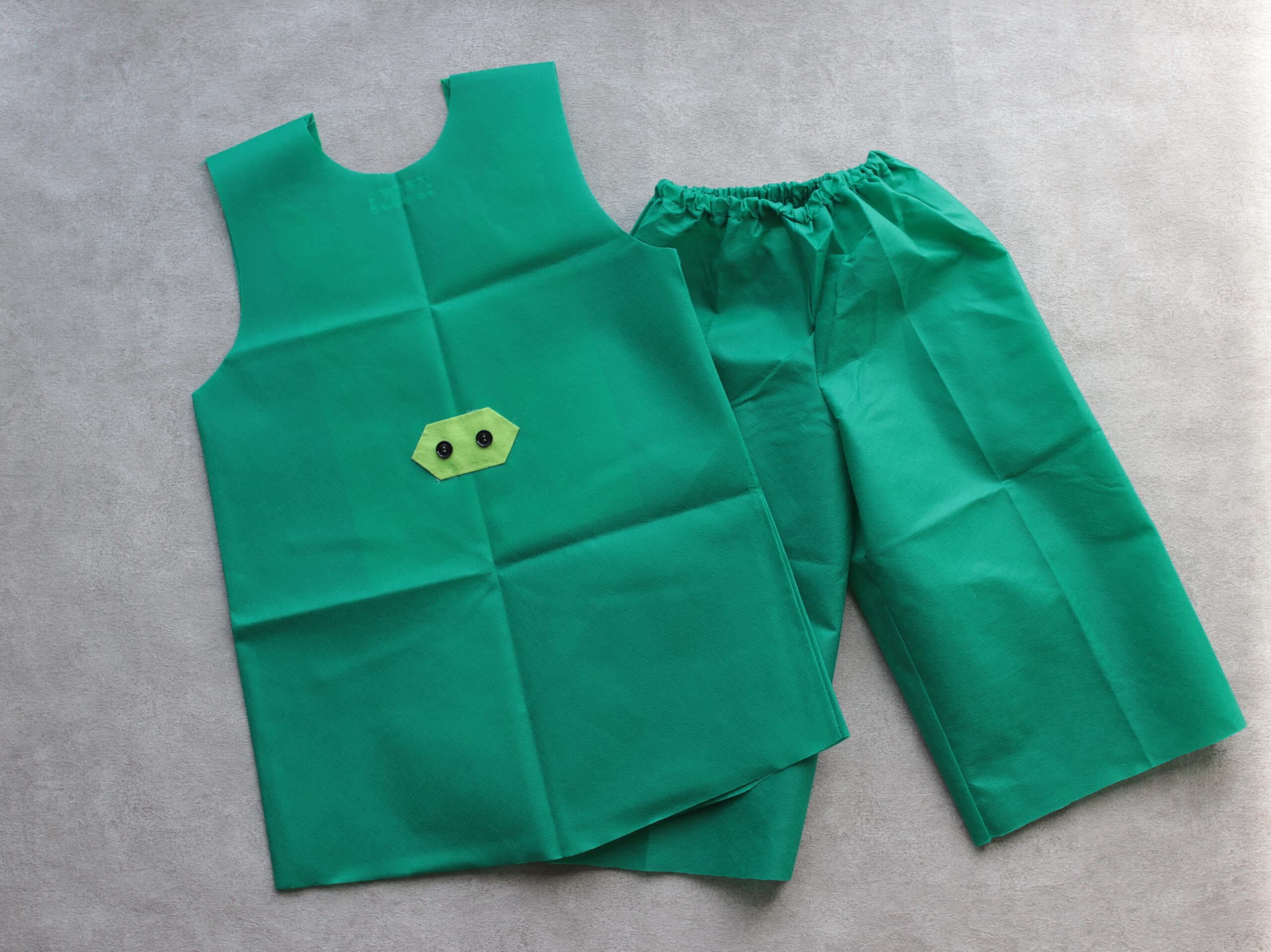 衣装づくりは、こういう不織布のトップスとズボンやスカートを配布され、先生の指示で裾をカットしたり、かぼちゃパンツ型にしたりするのですが、切りっぱなしだとどうしてもほつれてきてしまいます。