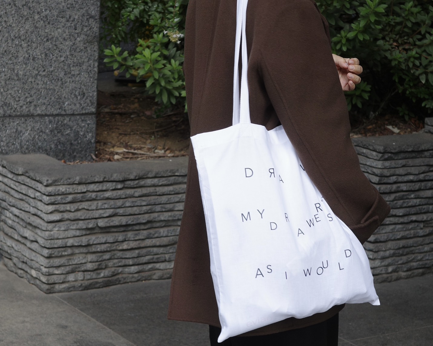普段から暗い色のコーディネートが多いので、差し色的に使えるかな?と最近購入したDraw Drawersのトートバッグ。