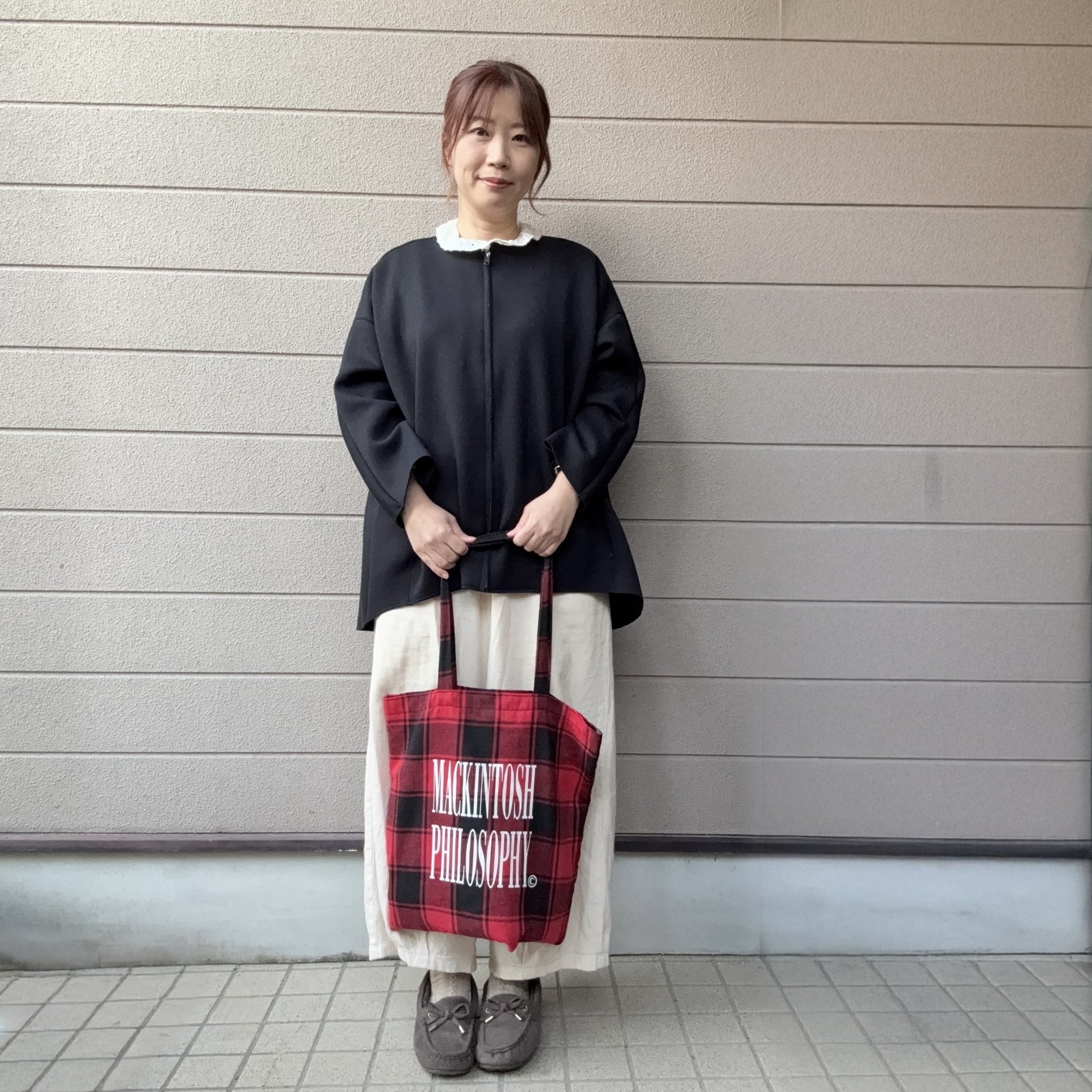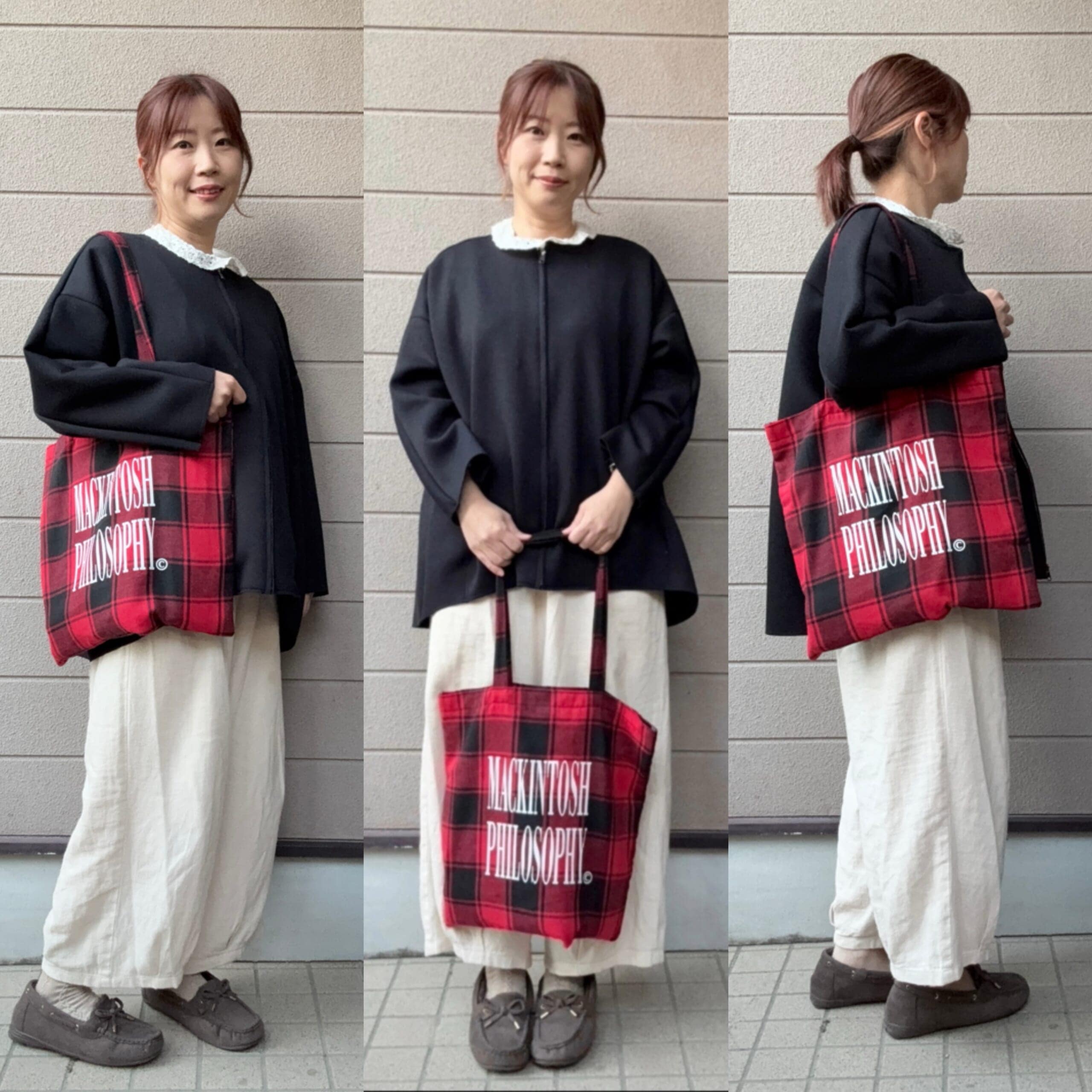 トートバッグの赤いチェック柄を映させたいので、洋服は黒×白のシンプルなカラーにしました。いかがでしょうか?