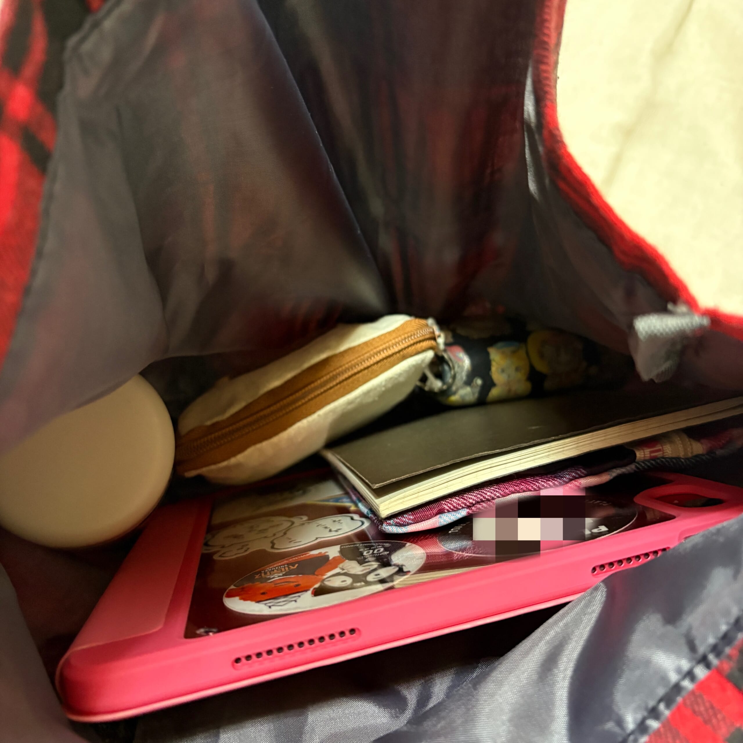 iPad、お財布、手帳、ポーチ、水筒…入れてみました。