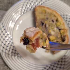 フォークで持ち上げた断面からも、ピスタチオやドライフルーツ、そして生地に練り込まれたホワイトチョコがたっぷりなのが分かりますか?!これがアクセントになっていて、私好みのバランスの取れた味わいでした♡