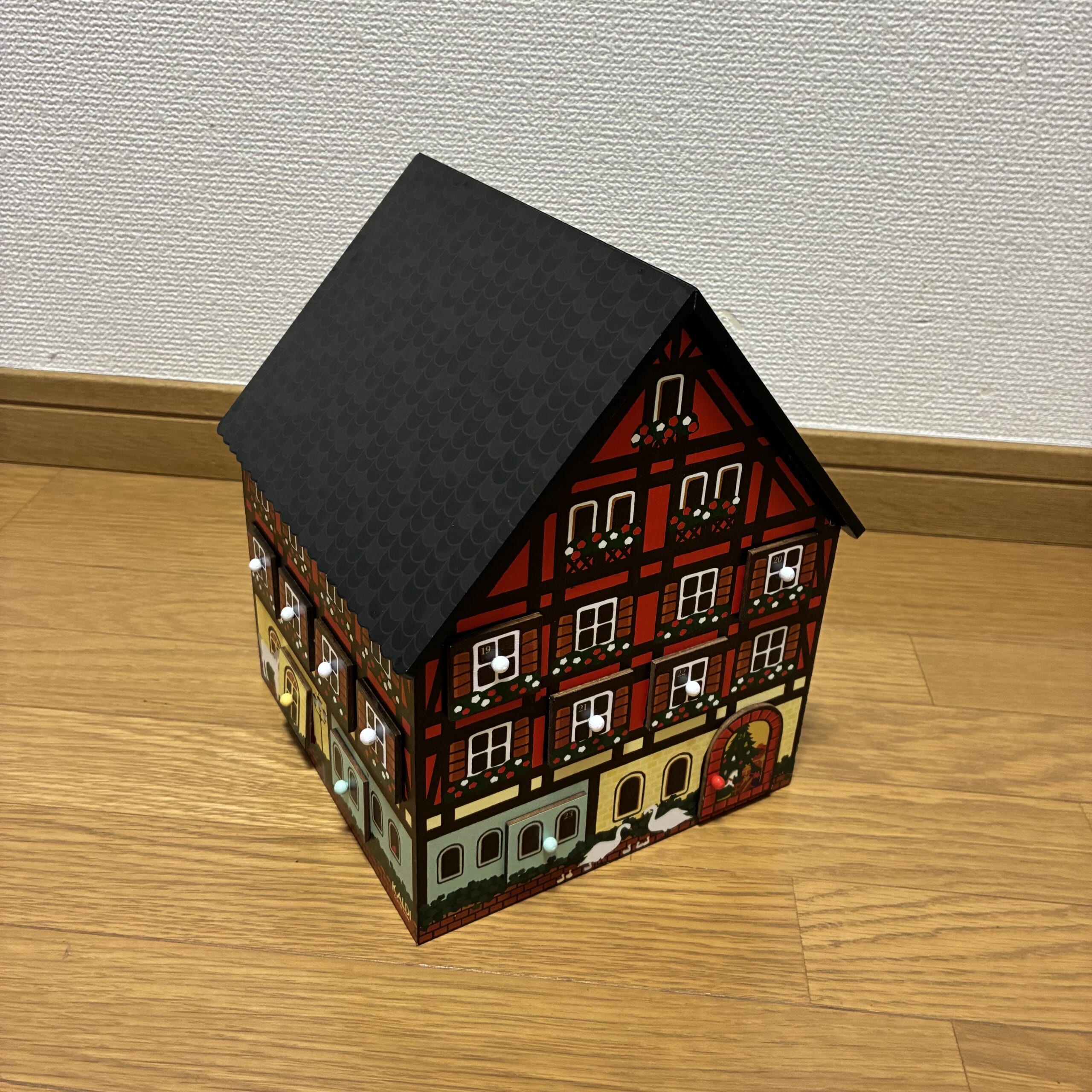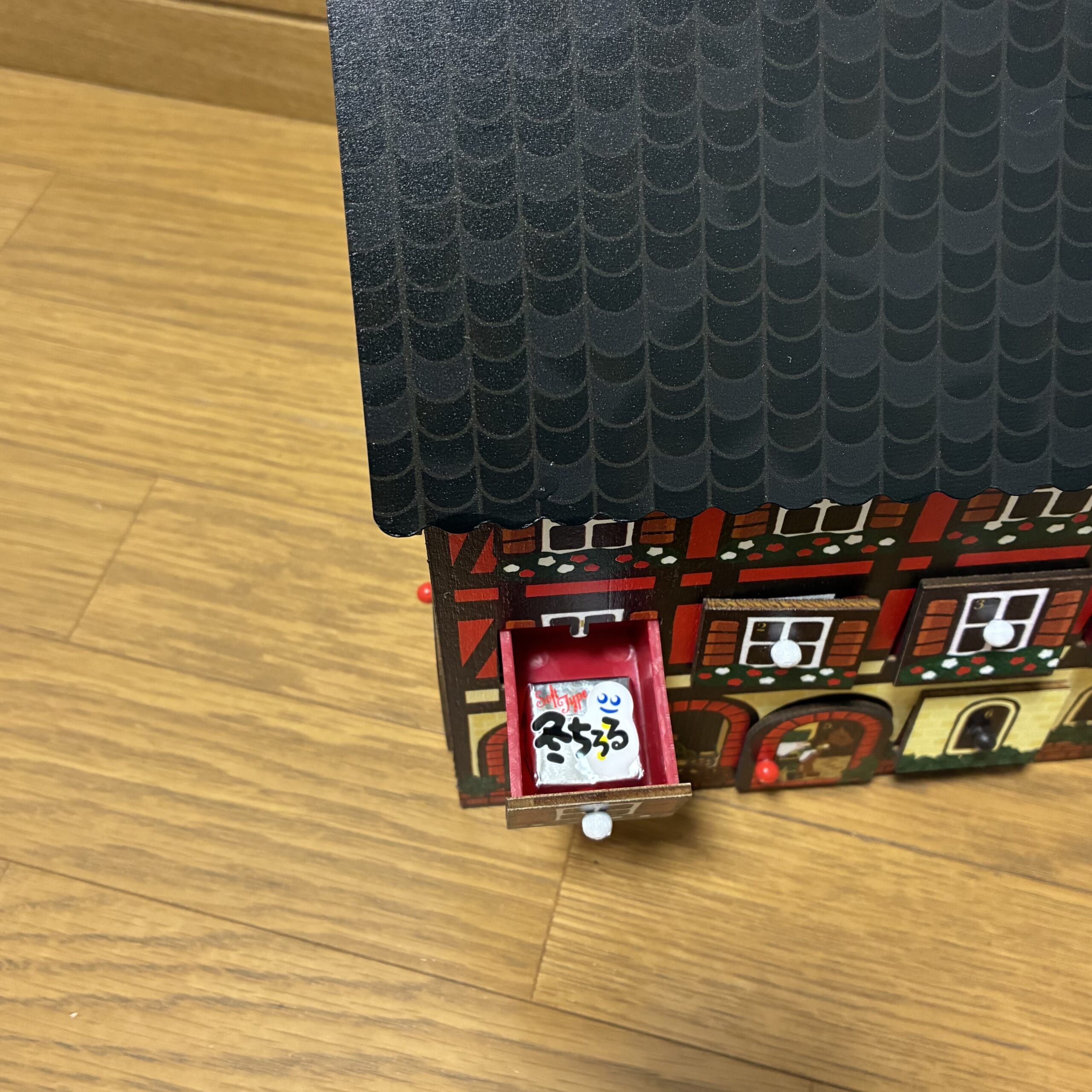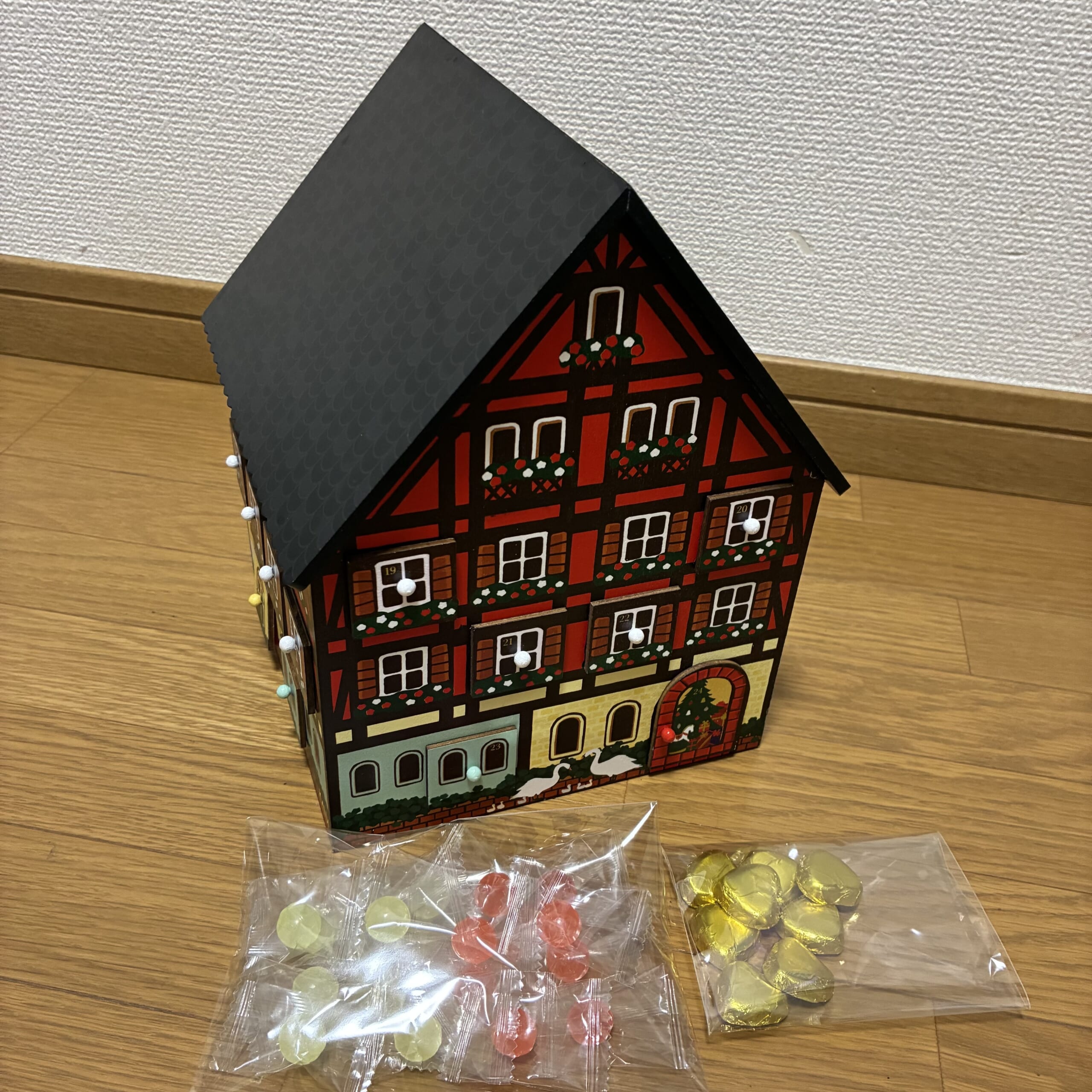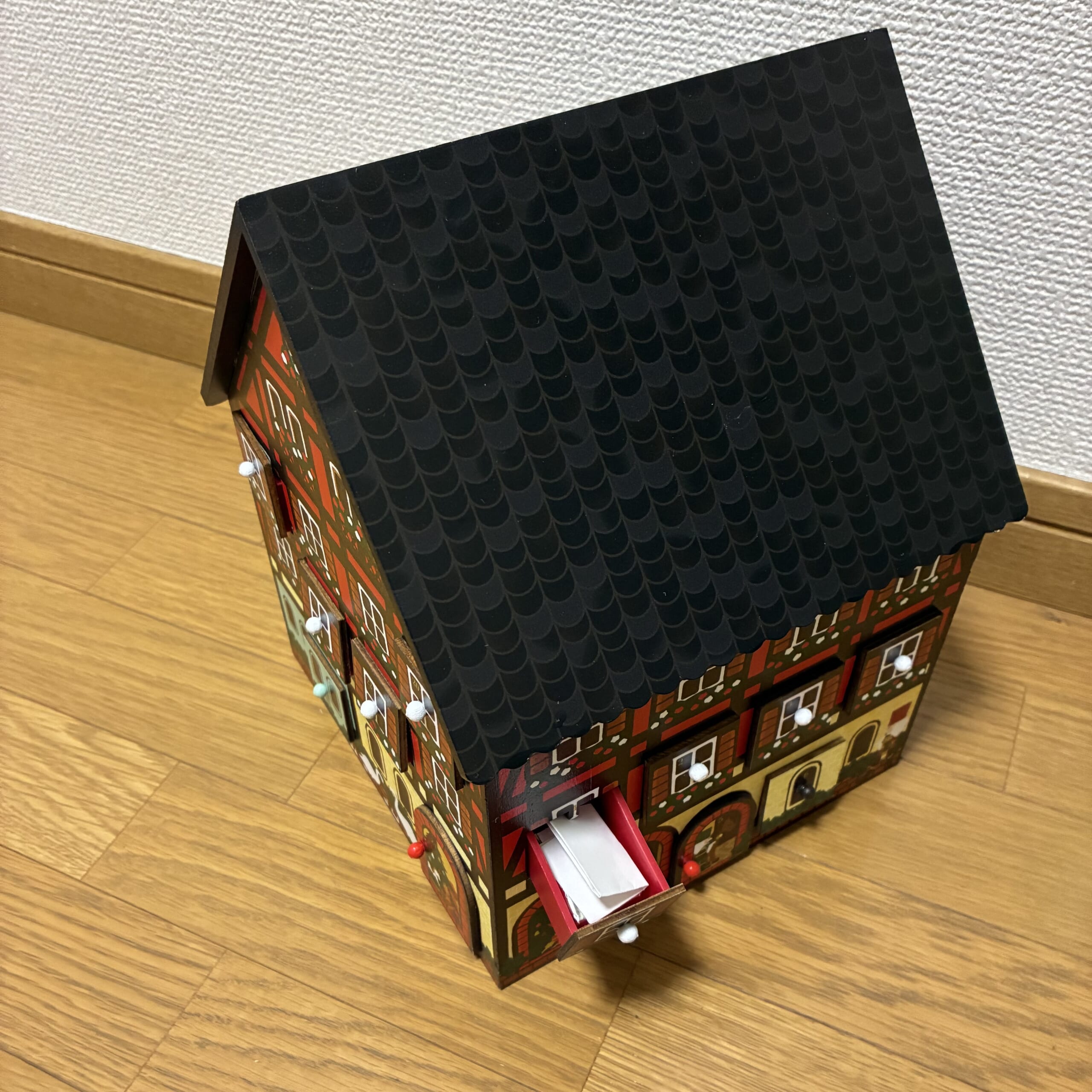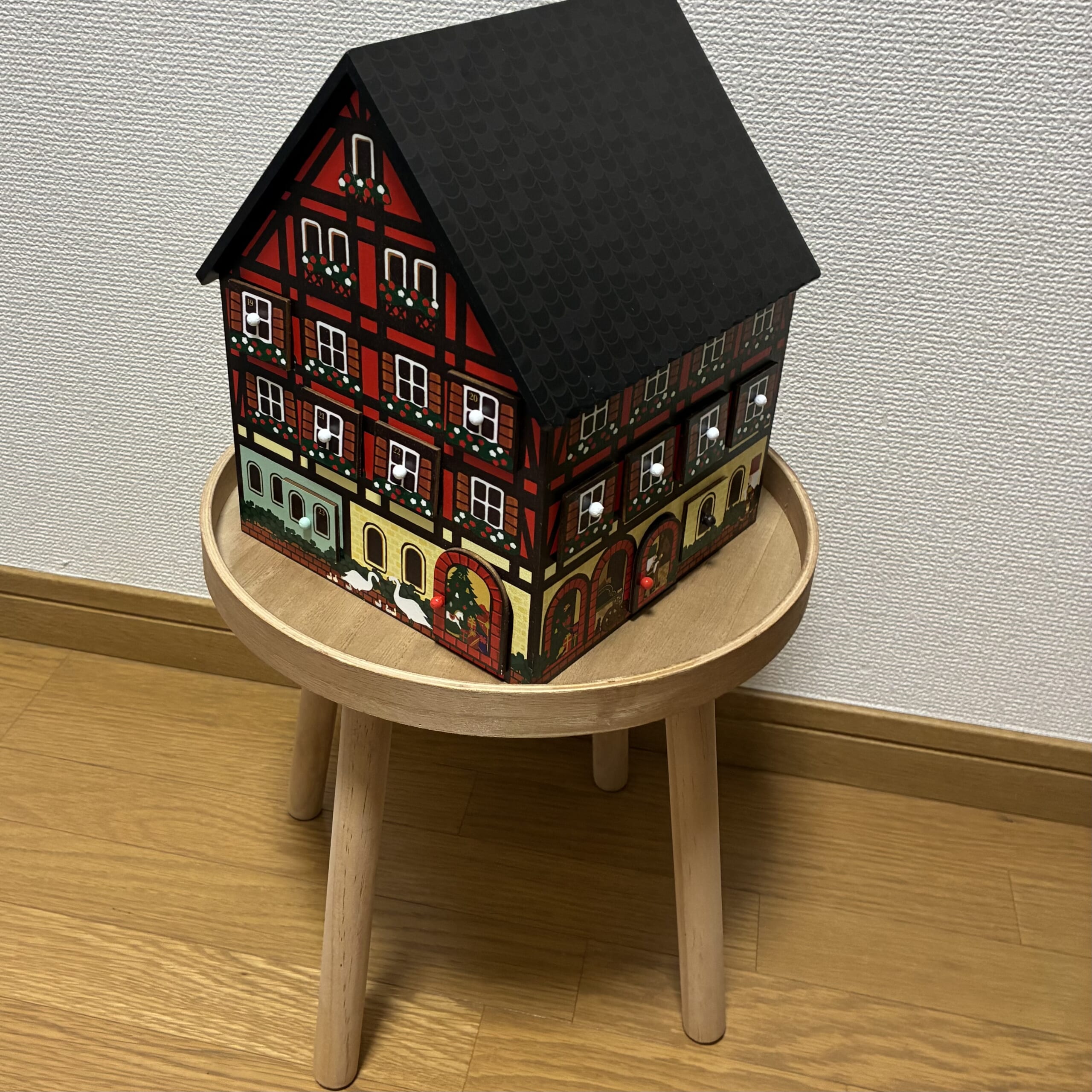 張り切ってこんな大きなアドベントカレンダーを購入しましたが、現在の我が家に飾り棚がほぼないので、組み立て式の机に乗せてます。