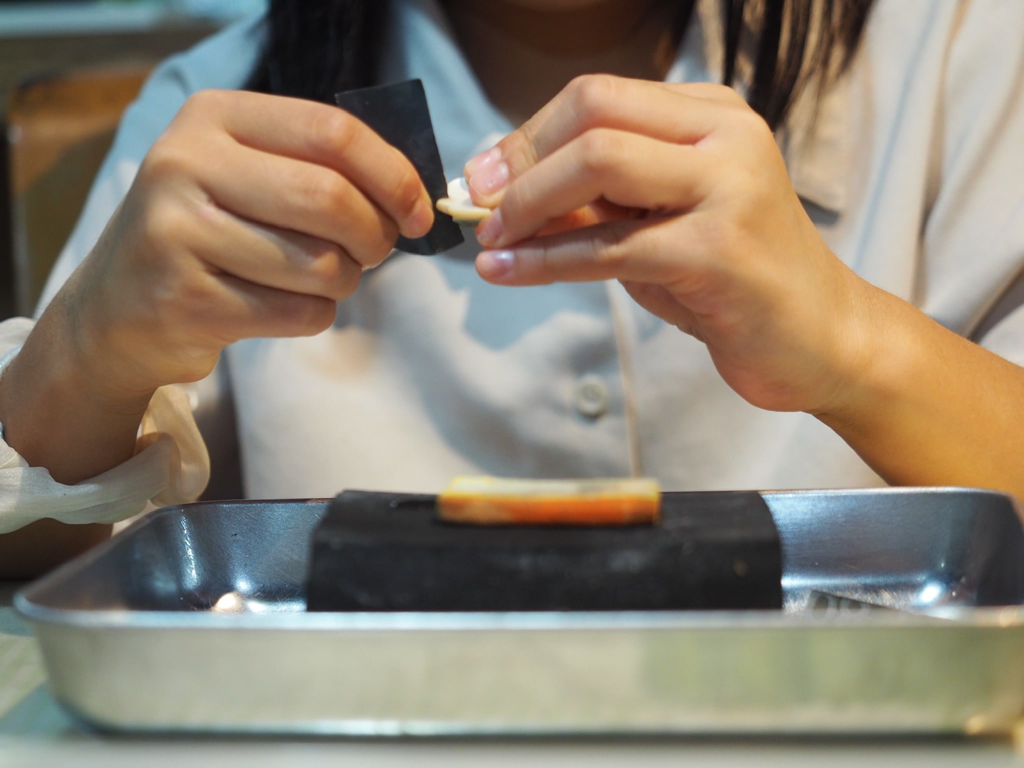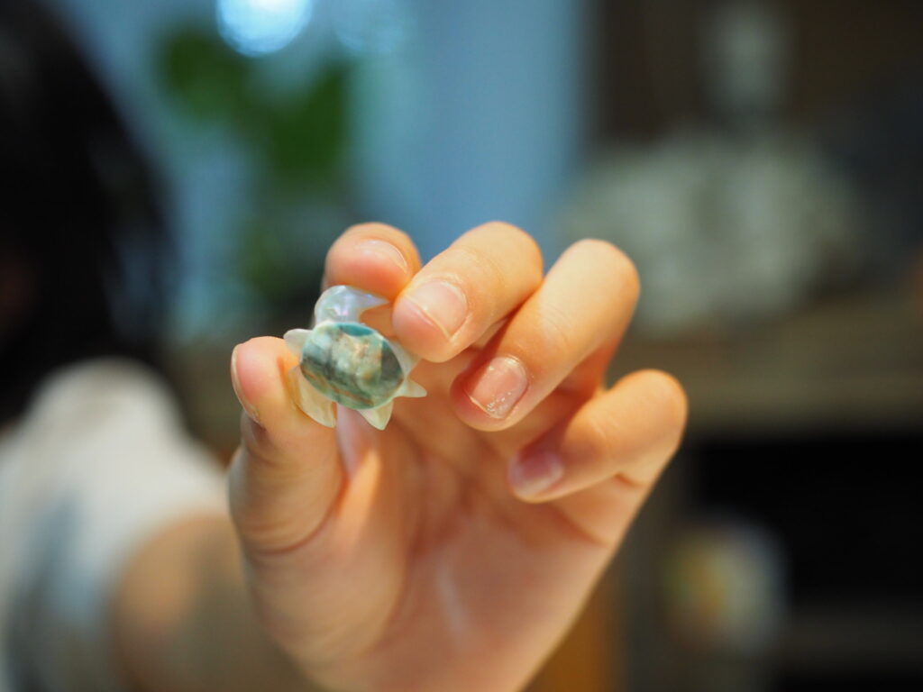 夜光貝は日本では沖縄や奄美地方にのみ生息する希少な貝。これをurukaの店主さんが色々なかたちにカットしてくれていて、私たちはヤスリで磨いていくだけ。磨くたびに輝いていく夜光貝にびっくり。