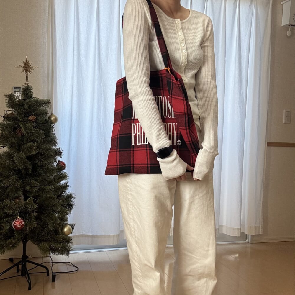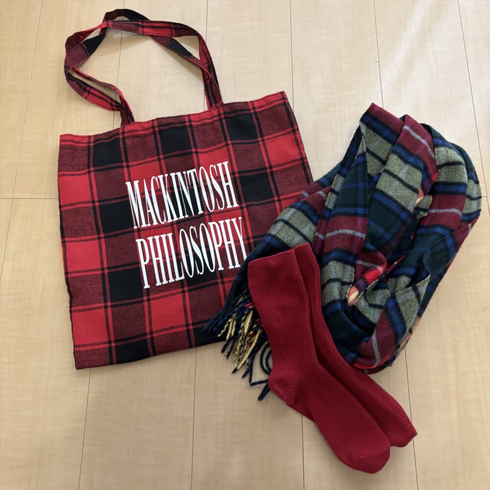 暗くなりがちな冬服に、バッグやマフラーで赤をひとさじ。