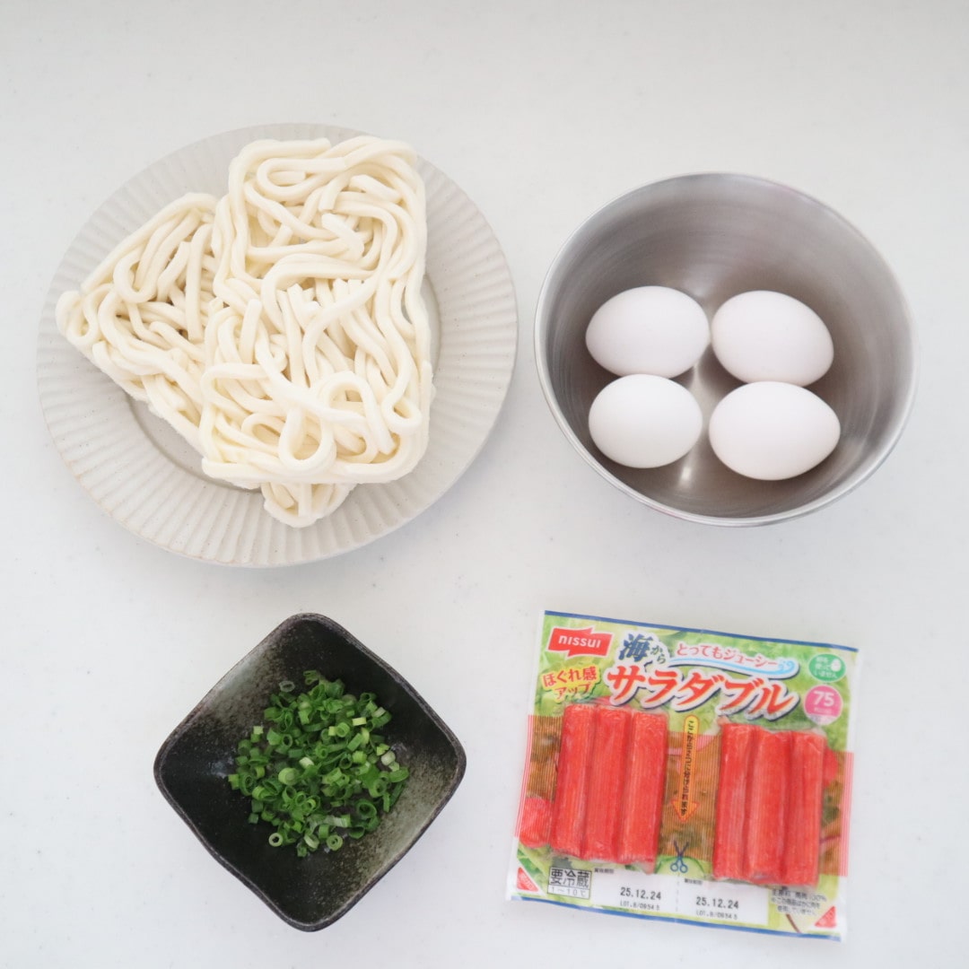 冷凍うどん、卵、カニ風味かまぼこ、小ねぎ。