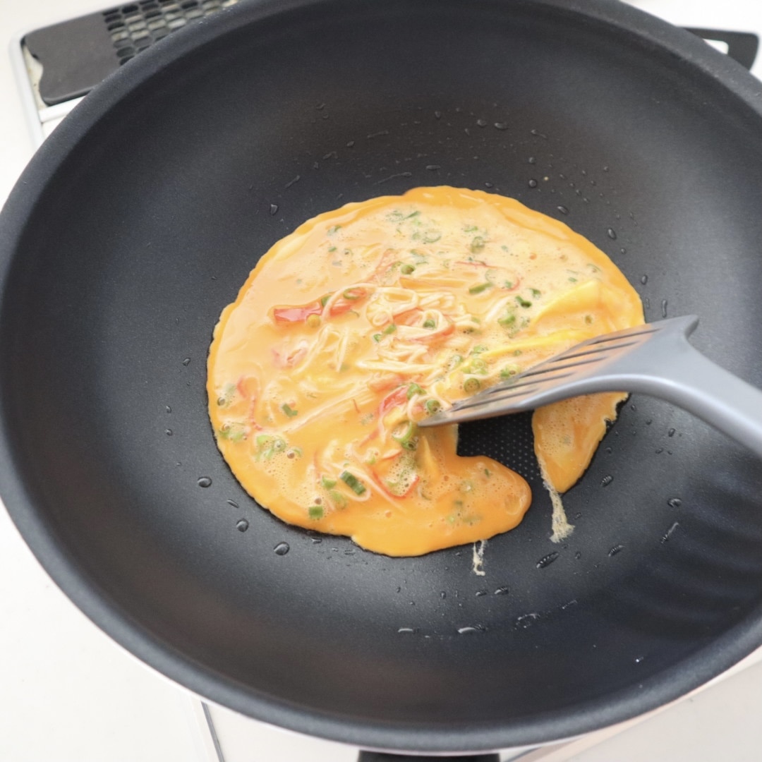 ポイントとして卵を入れてすぐさっと大きく混ぜると、ふわとろになるそうです。木べらの動きが小さいと、卵がポロポロのいり卵状になってしまうのだとか。