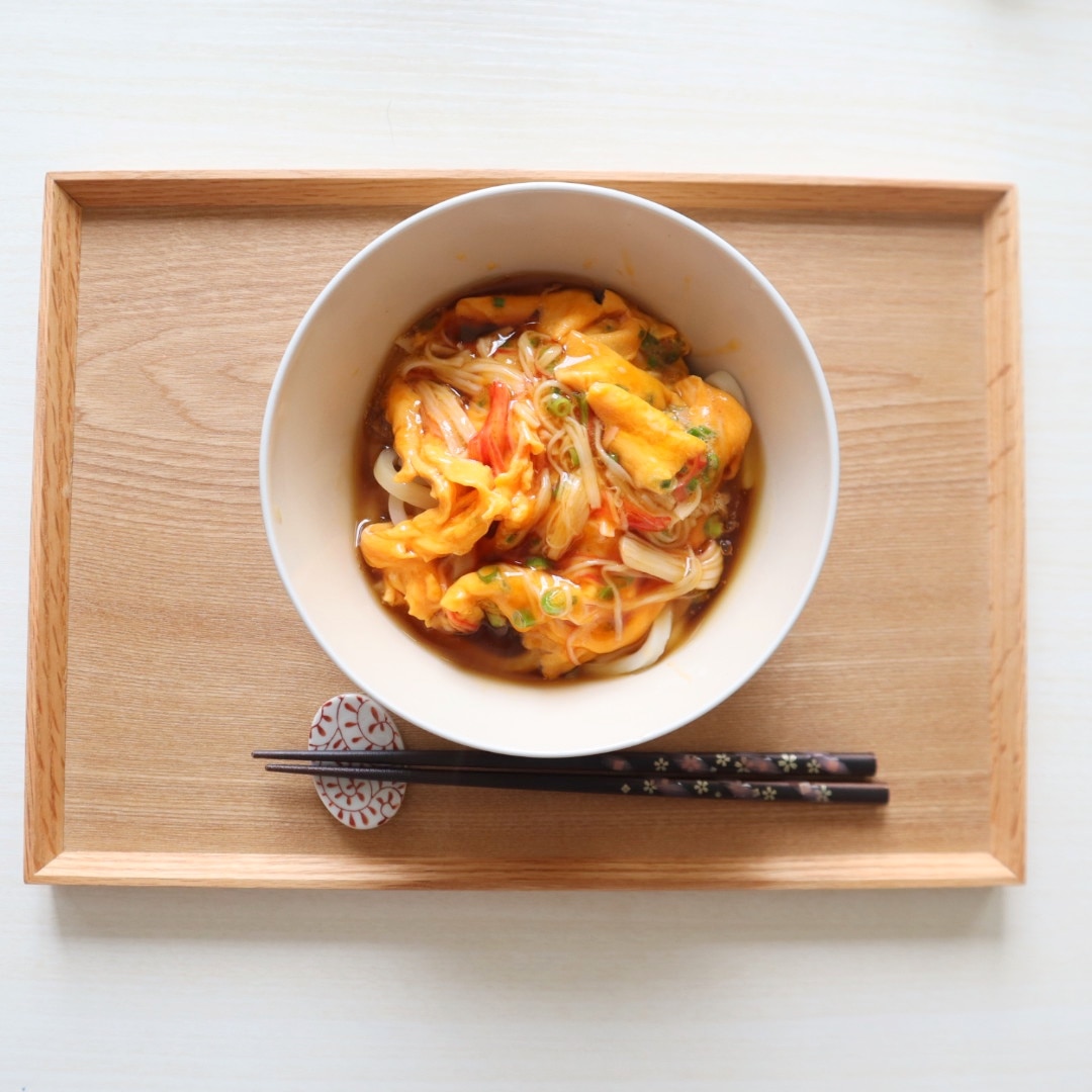 ふわっと軽い天津の卵と、コシのあるうどんの食感が楽しい一杯。