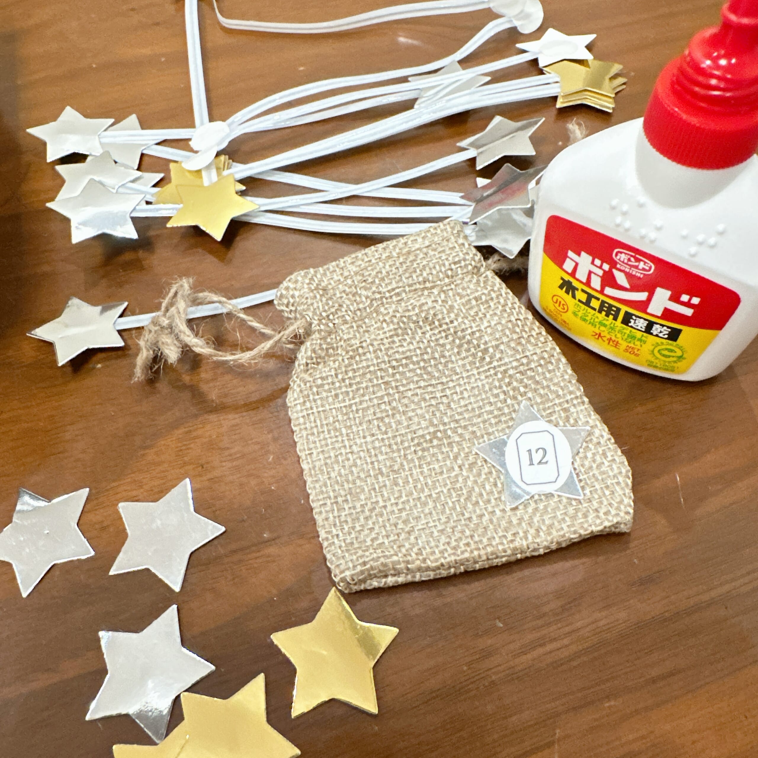 星にボンドをちょんとつけて、麻袋に貼っていく作戦に切り替えました!