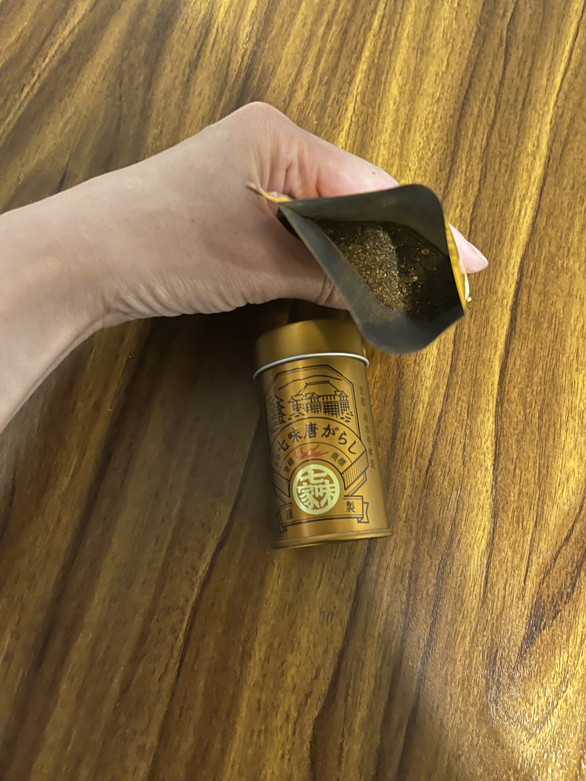 唐辛子、山椒、黒胡麻、白胡麻、紫蘇、青海苔、麻の実、この七つの薬味入っていますが、 辛さを控えめでとても上品な味わいでした!