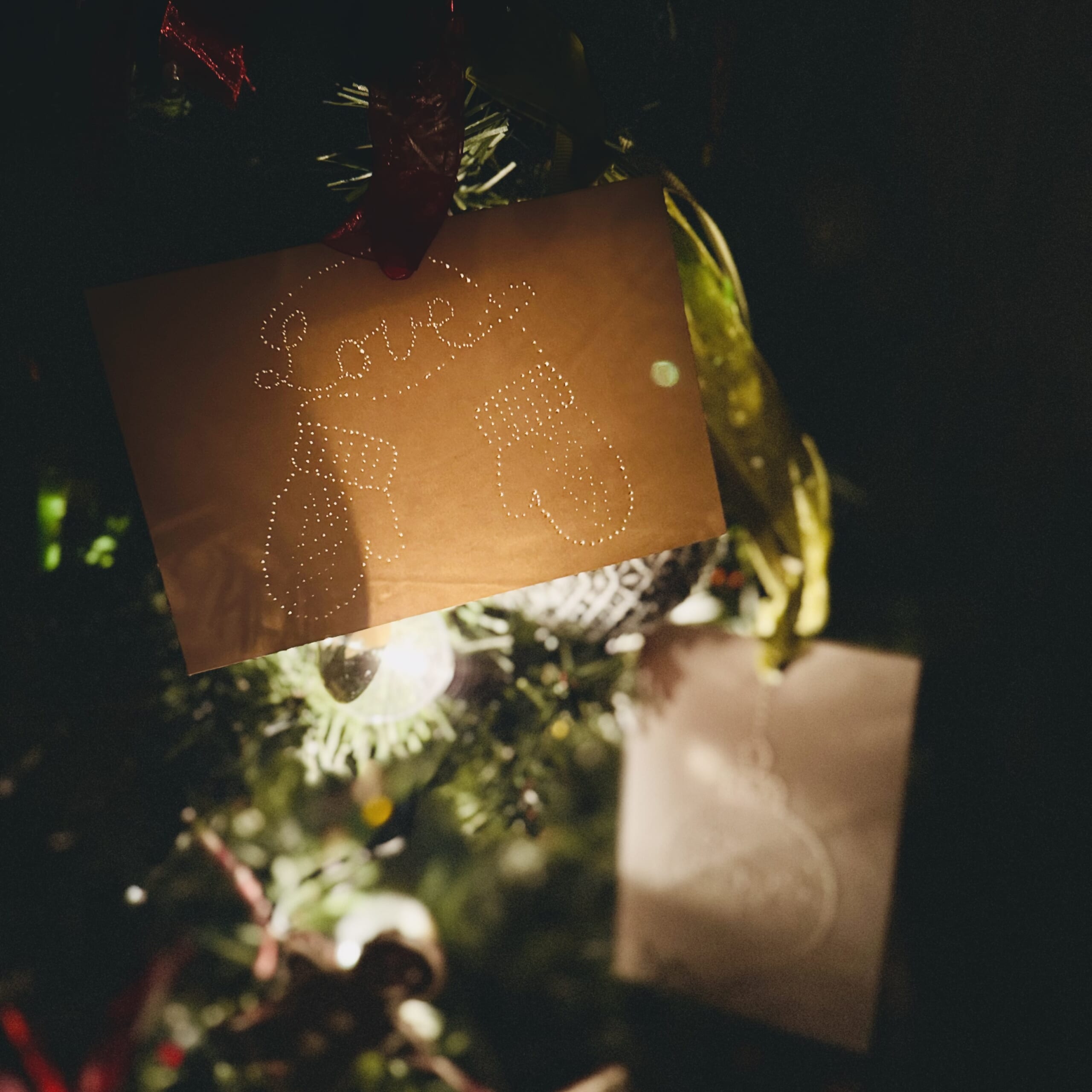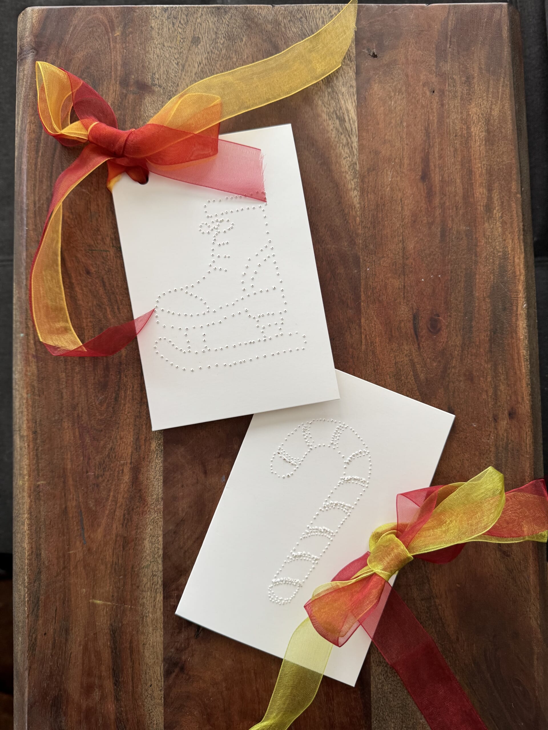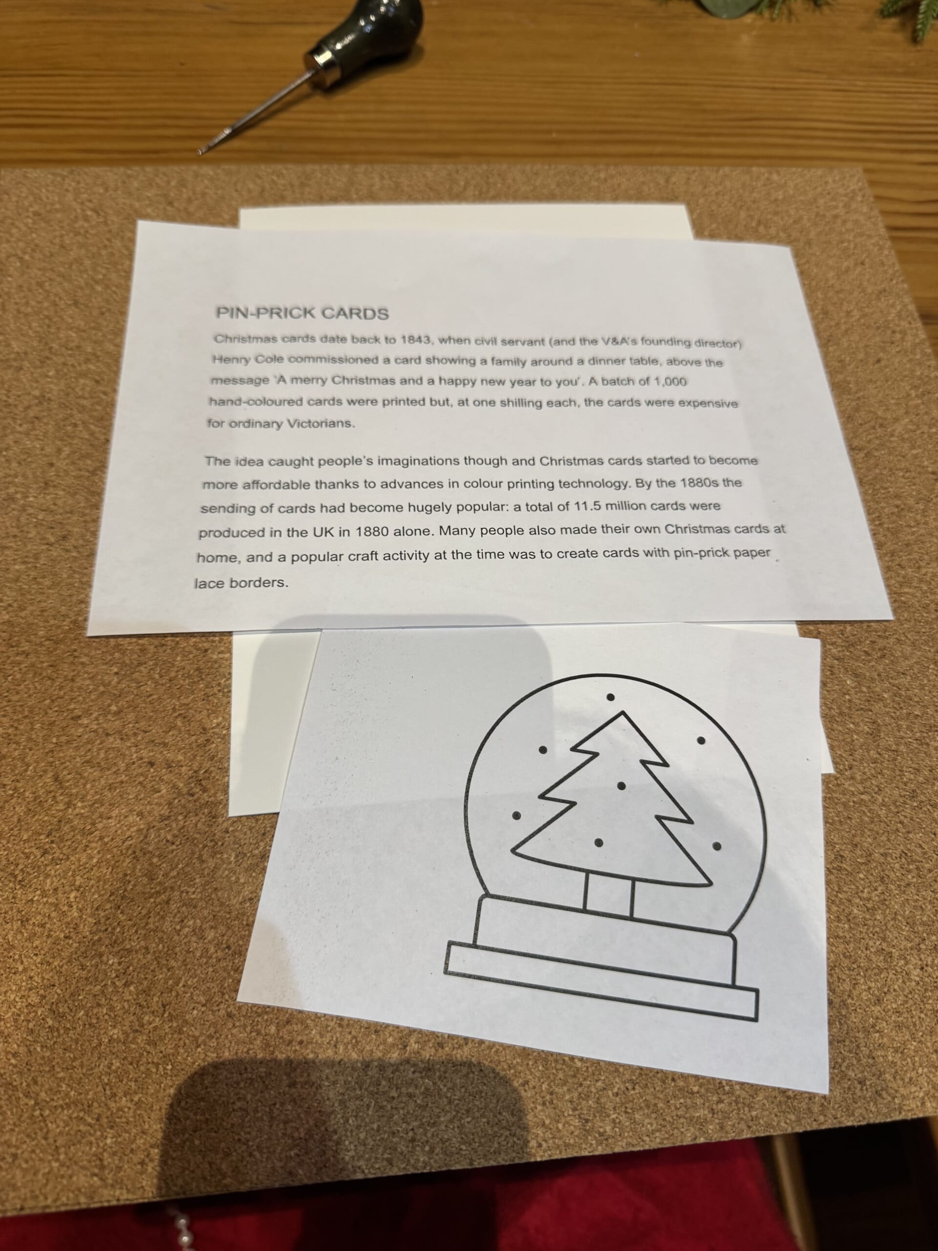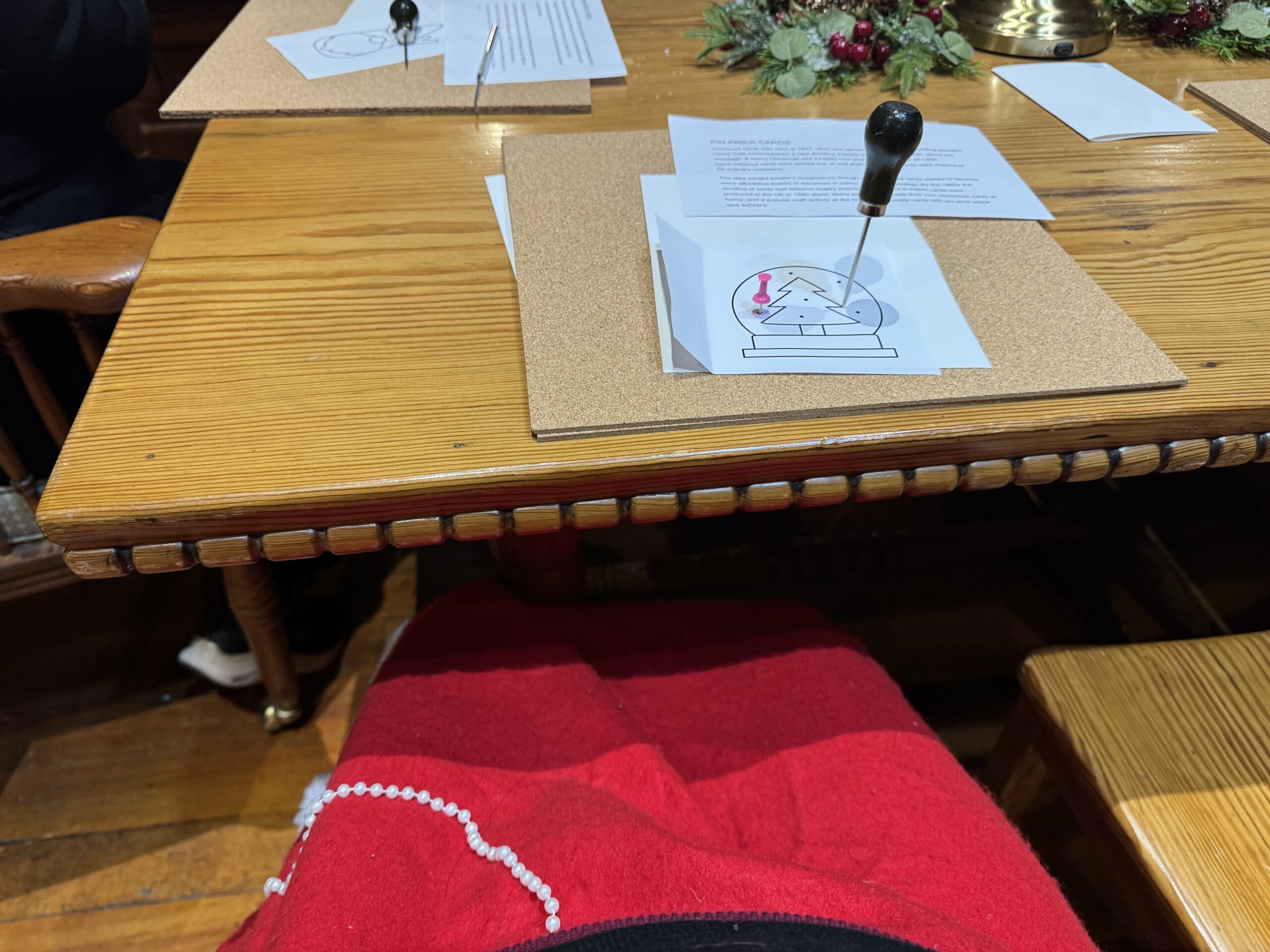 押しピンや千枚通しを使って白いカードひたすら穴を開けていくというもの。まだ印刷という技術が一般的でない時代。クリスマスカードという概念が出来上がった頃にお家でできるカード作りで大流行したらしいカードです。