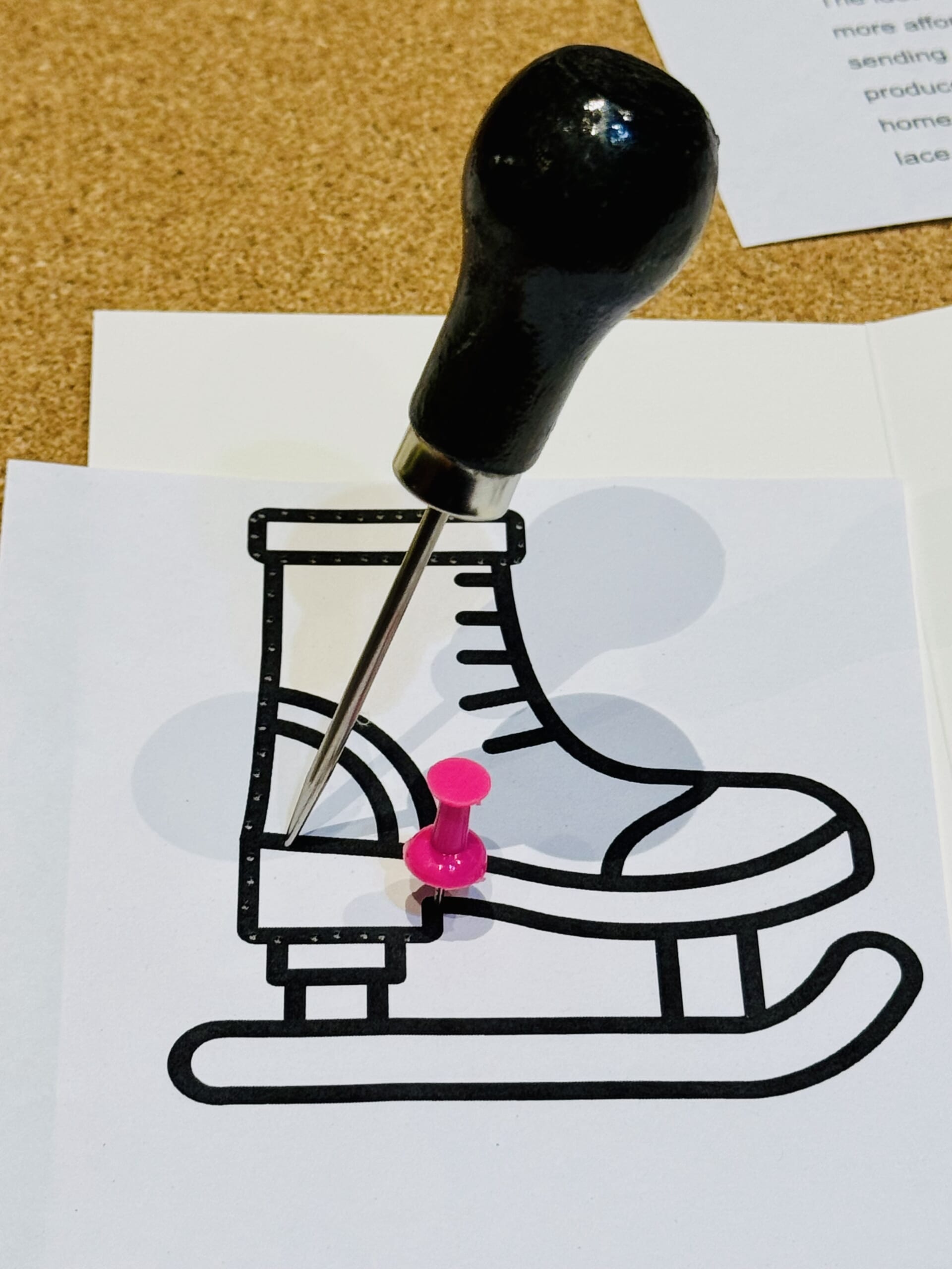カードの表側を決めたら、その裏に下絵の位置を決めてカードの裏側から針で下絵の線に沿ってひたすら穴を開けていきます。裏側からさすことで表面に立体感が出るようです。