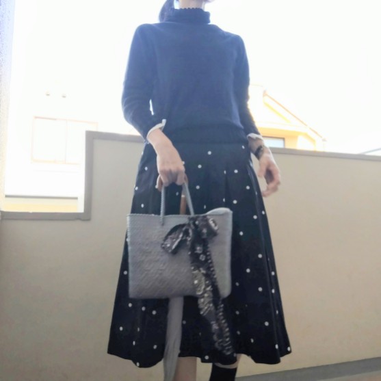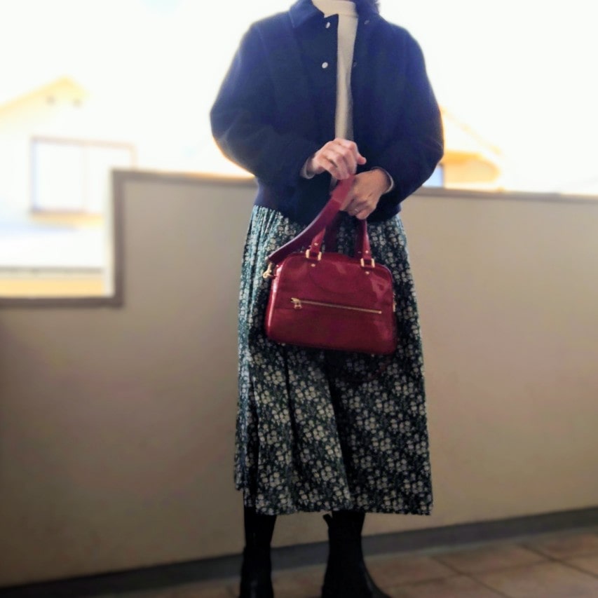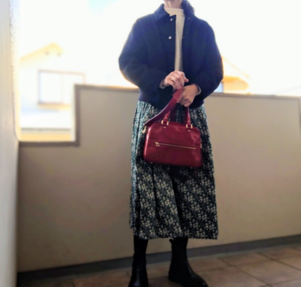 リバティがソーイング作家の伊藤みちよさんとコラボしたグリーンのカペルで作ったワンピースに白いニットを重ねたスタイルで。赤いバッグを持ってクリスマスコーデですね。笑